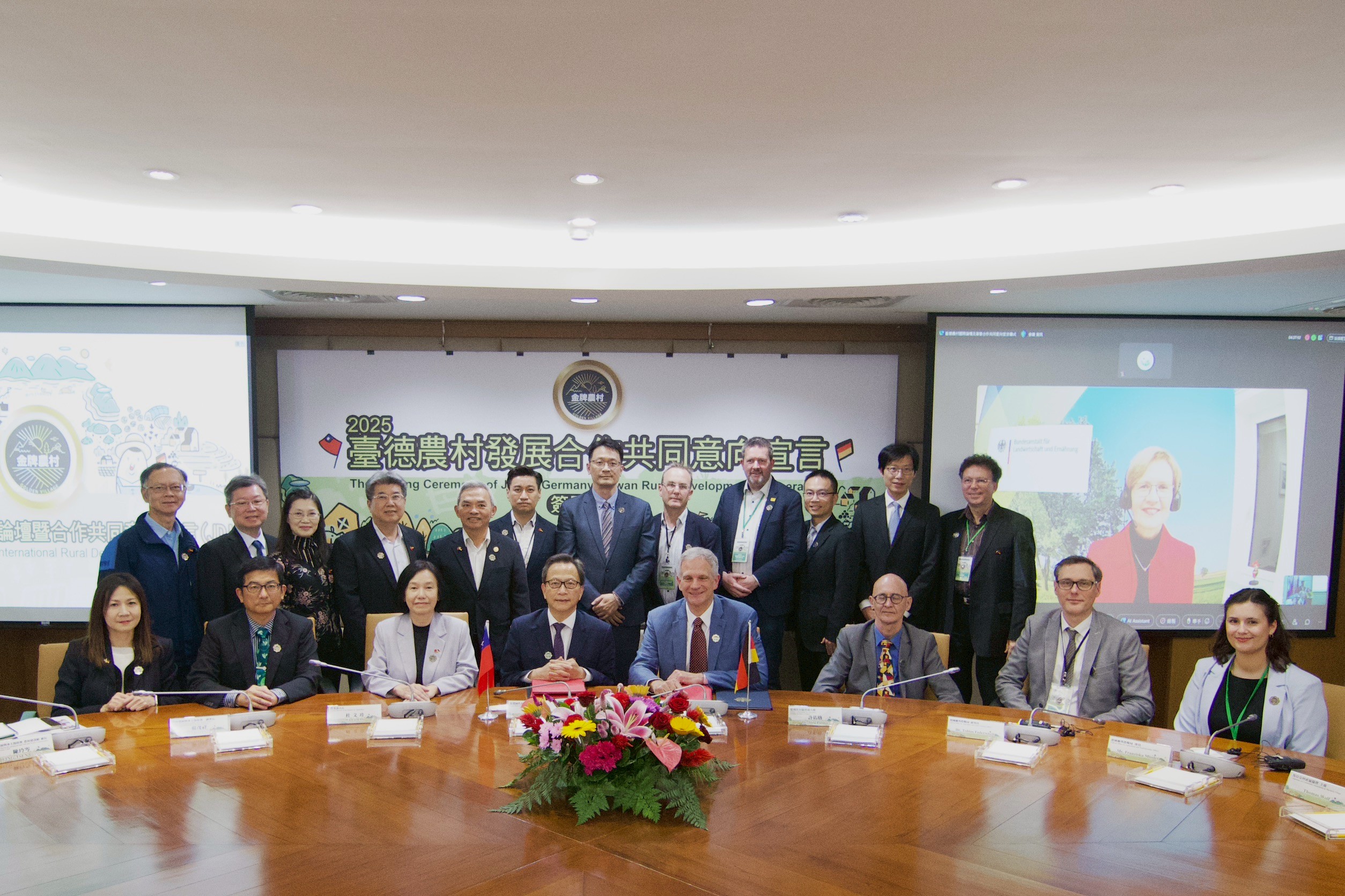 農村水保署與德國聯邦農糧局推動多年的交流合作,於今日正式舉行「2025 臺德國際農村發展論壇暨合作共同意向宣言(JDI)簽署儀式」。儀式中,我國駐德國代表處大使 Gu Ruey-sheng (谷瑞生) 及德國在台協會大使 Karsten Tietz (狄嘉信) 代表雙邊大使率先簽署,確立臺德在永續農村發展領域的深度合作,共同應對快速國際情勢變遷下農村轉型與創新的挑戰。儀式期間,農業部杜文珍次長特別說明,臺德兩國各自具有不同農業技術與農村特色,透過兩國交流分享各自優勢,互相學習並共同進步,以 JDI 作為起點,一起實踐農村永續發展目標,為雙方人民創造更優質的生活環境 。