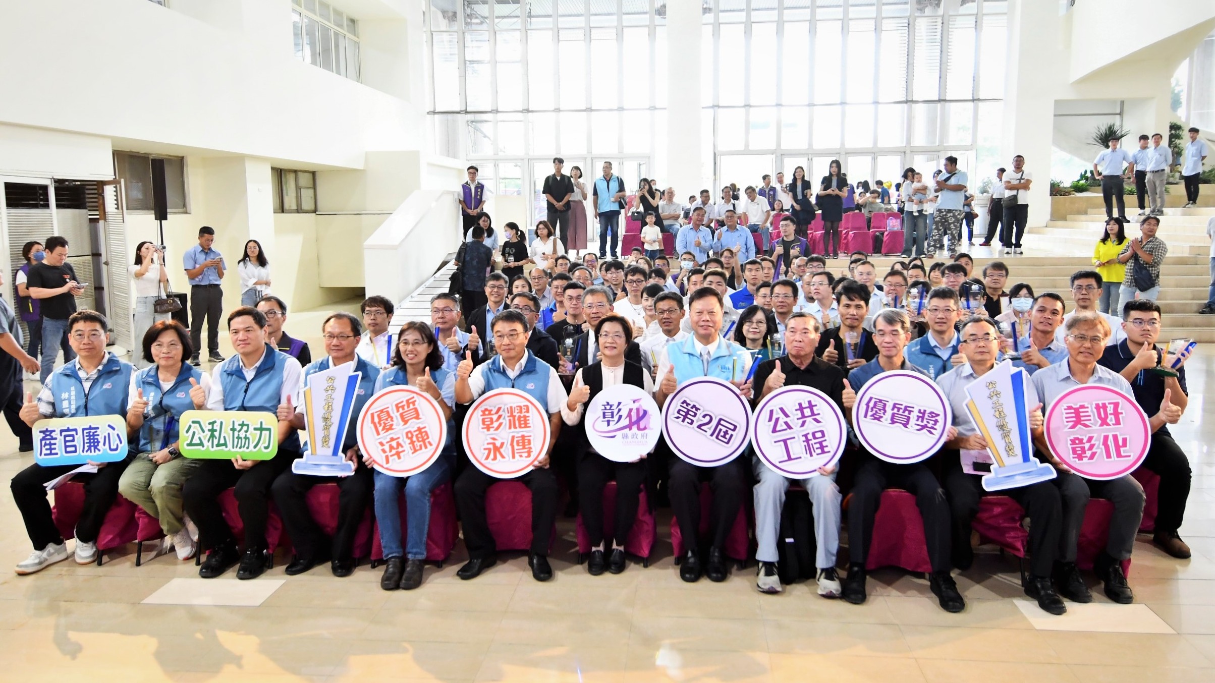 (記者邱暐茹 彰化報導)彰化縣政府15日上午於縣府1樓中庭舉行第二屆「彰化縣政府公共工程優質獎」頒獎典禮,縣長王惠美親自頒獎表揚優良建設團隊。王縣長表示,本次共有35件參獎,入圍有25件,得獎的有土木、水利、建築設施及文化資產等4大類19件,其中3件特優,7件優等,9件佳作,恭喜所有脫穎而出的得獎者。也感謝各項優質公共建設的幕後英雄,藉由提升公共工程施工品質,促進廠商良性競爭,改善生活環境,彰顯彰化公共工程「優質淬鍊‧彰耀永傳」的精神。