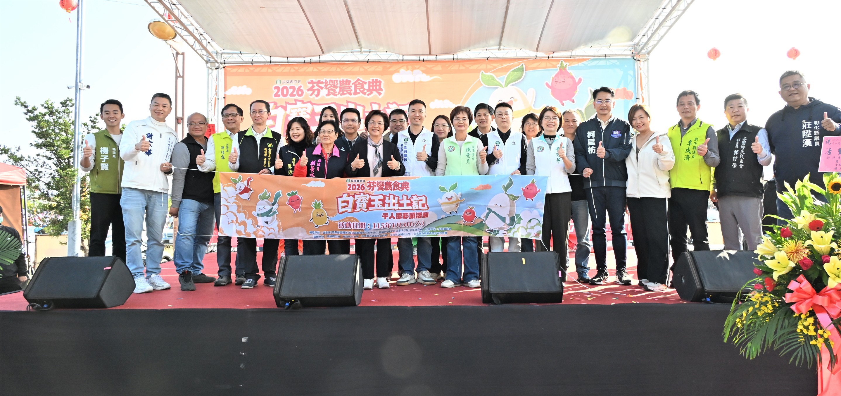 (記者邱暐茹 彰化報導)芬園鄉農會舉辦「2026芬響農食典白寶玉出土記」,今(3)日在芬園鄉寶藏寺盛大登場,彰化縣長王惠美應邀與會,芬園鄉農會理事長郭子豪、總幹事黃翊愷、常務監事葉豐樑等人與會,現場近5、6千名鄉親共襄盛舉。今年活動以農會品牌 Logo「芬饗」為核心,結合深受民眾喜愛的「拔蘿蔔」體驗活動,傳達「從產地到餐桌,真誠饗宴」的理念,讓民眾親身走進農村、體驗農事樂趣。周圍環繞縣府與地方合作推動的景觀花海,彰化縣長王惠美誠摯邀請全國鄉親安排假期暢遊彰化,走入花卉綻放的田野,親身感受百花盛開的季節與時光。