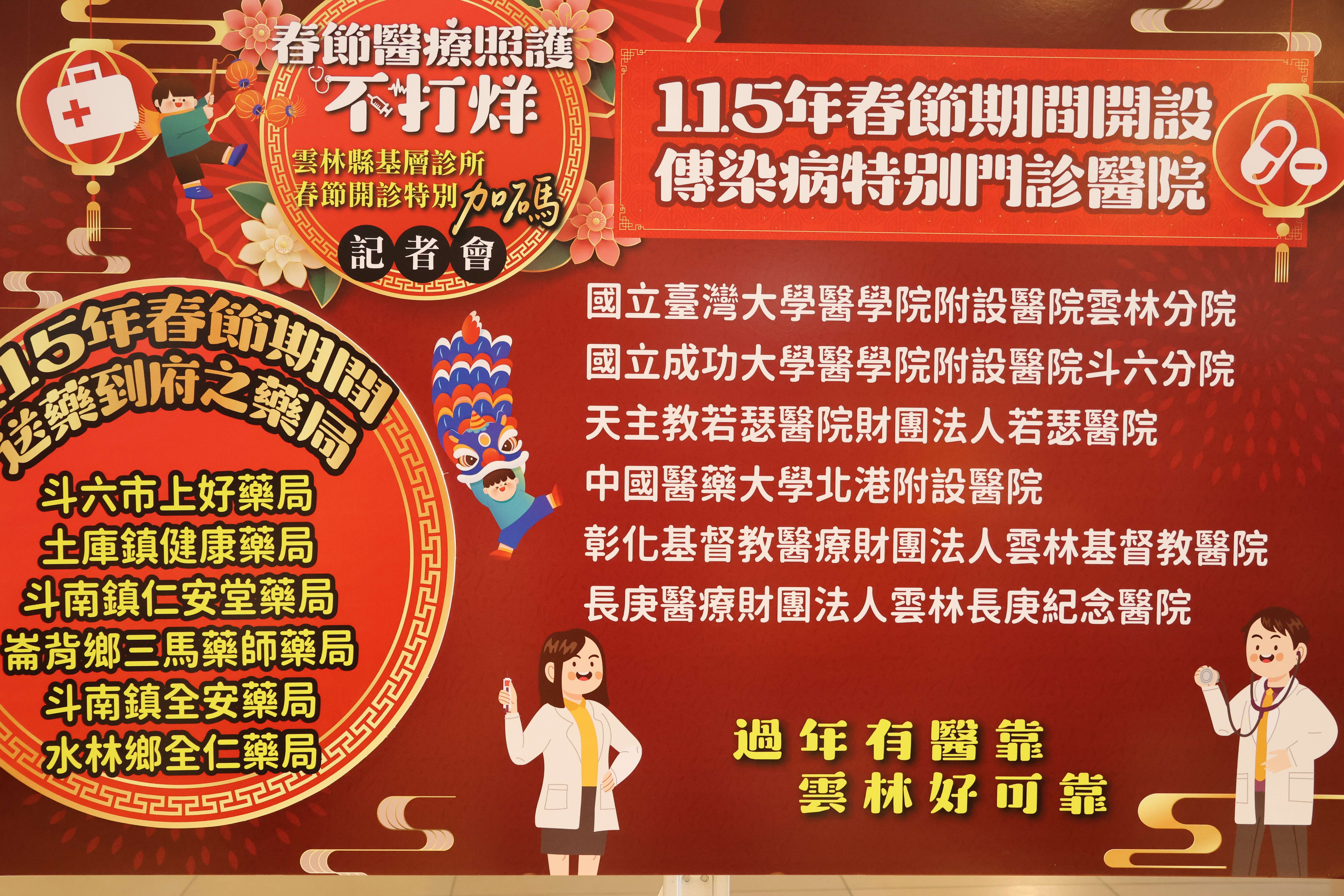 雲林縣醫師公會理事長丁榮哲與藥師公會理事長許仁厚表示,本次春節醫療整備不僅衛生局超前部署,醫界也全面投入。初一至初三共提供190診次門診服務,健保藥局約七成不打烊,並加碼送藥到府,山線、海線各有3家健保藥局隨時支援行動不便者,春節期間醫療服務不打折。