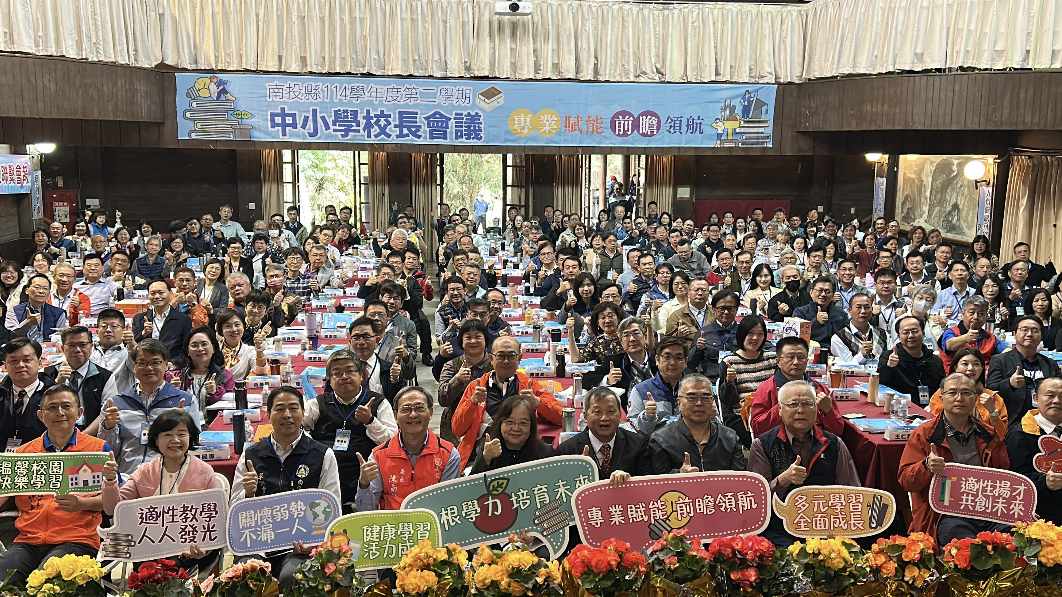 本次校長會議以「專業賦能、前瞻啟航」為主題,邀集縣內高中職、國中小學校長齊聚一堂,校長是學校首席教師,更是帶動南投教育創新的火車頭,期許透過專業領導的深耕與數位科技的導入,厚植教學力。王副縣長肯定校長們在教育現場的專業付出,並提出南投教育的整體願景與未來方向,期盼透過專業強化、科技創新與均衡發展,為南投孩子打造更具競爭力的優質學習環境。南投的教育需要一份「溫暖的堅持」,優質的教育更是校園最重要的基礎工程,面對全球變動與科技浪潮,以更前瞻的視野推動教育革新。王副縣長並提出六項教育重點勉勵校長,他指出:校長能多與社會良性互動、熟悉與瞭解教育法制、面對教育困境仍要熱情積極承擔挑戰、重視學生的品德教育、教導正確的國家觀念,並請校長在公務繁忙下也要重視個人健康。縣府將支持校長持續以務實態度推動教育政策,提升教育品質。