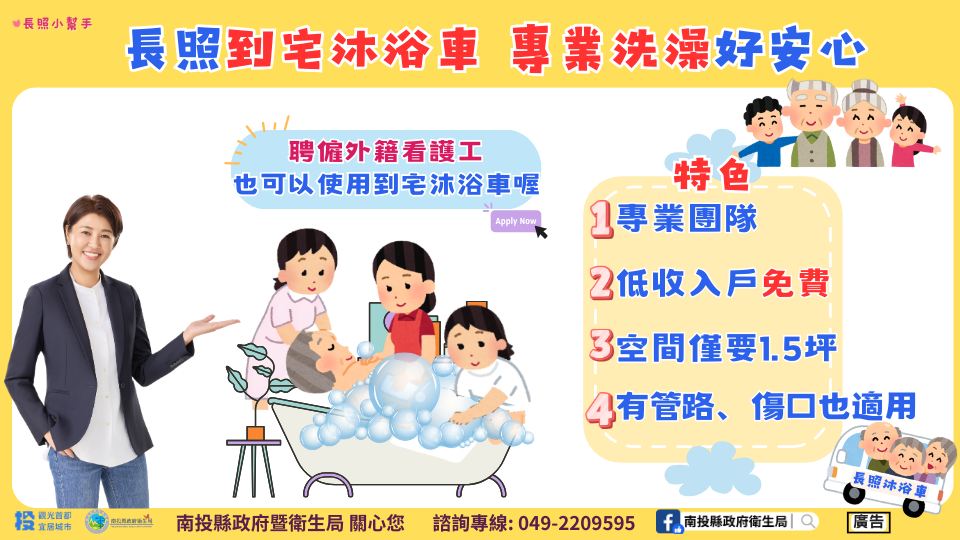 南投縣政府持續推動到宅沐浴車服務,114年1至12月已有208位失能者受惠,累計服務3818次,顯示該服務在提升居家照護便利性與安全性逐漸獲得民眾肯定與需求。目前縣內設有3家服務單位,包括:財團法人愚人之友社會福利慈善事業基金會附設私立愚人之友綜合長照機構、社團法人臺灣樂福國際慈善福利協會、東華醫院附設南投縣私立東華居家式長期照顧服務機構,服務範圍涵蓋13鄉鎮市。