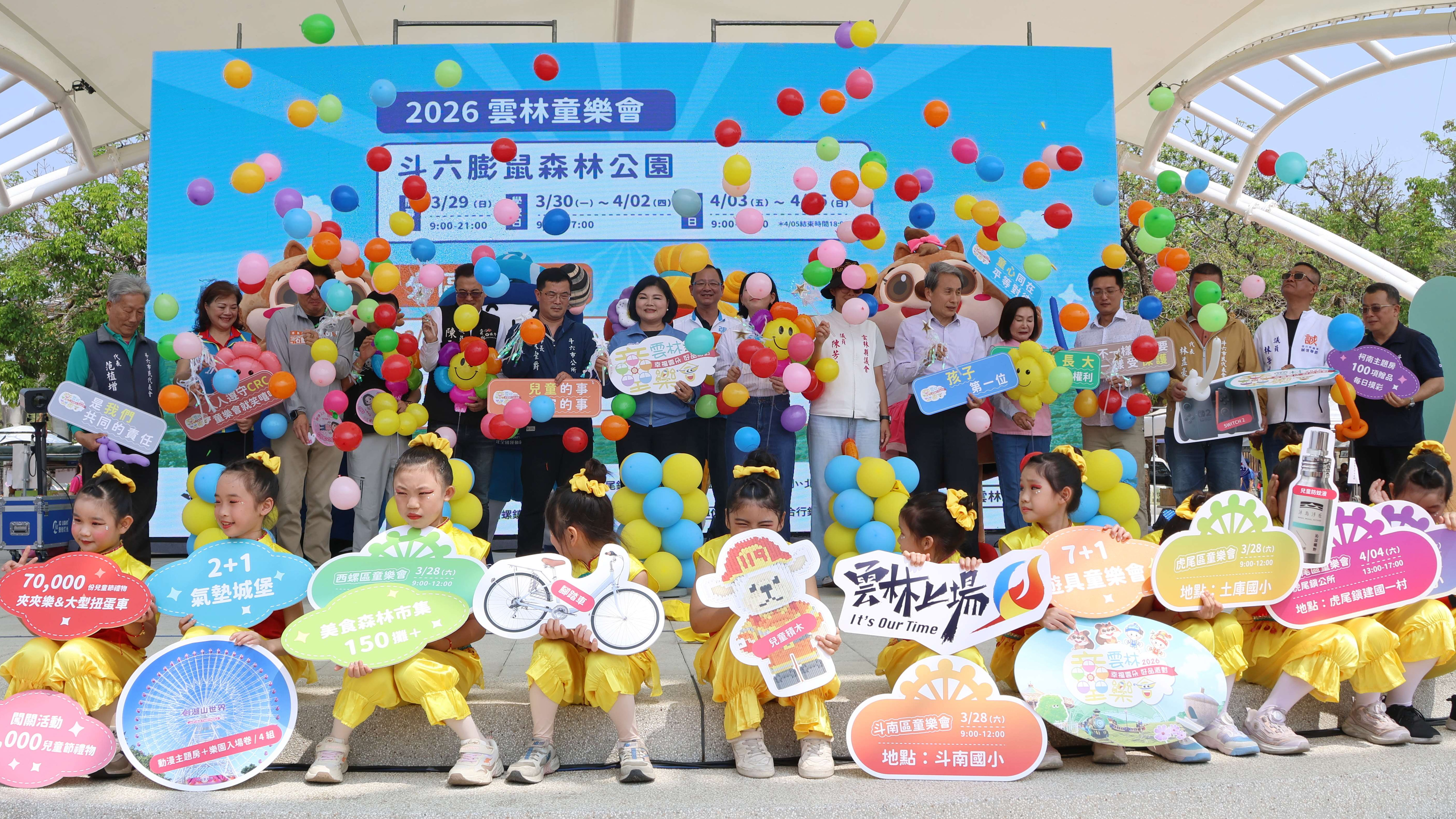 雲林縣政府教育處長邱孝文表示,膨鼠公園從即日起至4月5日化身為「兒童樂園」,設有氣墊城堡、摩天輪、旋轉木馬、小火車、海盜船、炫風飛車、水泥扭蛋車、搖擺飛飛、漂浮熱氣球及飛天魔椅等大型遊具,同時安排趣味競賽、攀樹及玩具體驗活動,闖關完成可兌換扭蛋和夾夾樂,更有劍湖山住宿券、腳踏車、樂高等豐富獎品,活動詳情可至「2026雲林童樂會」粉絲專頁查詢。