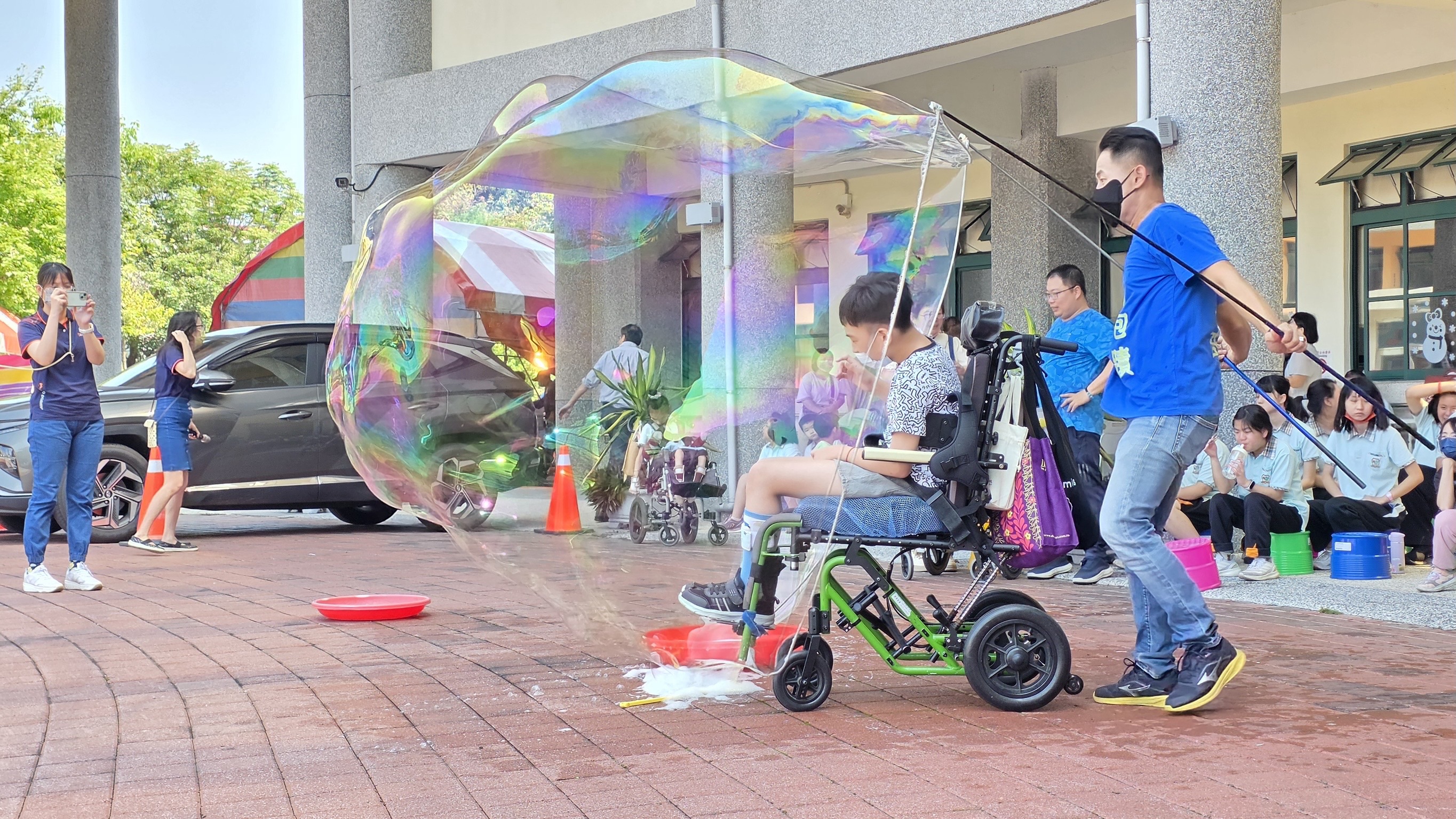 活動在「泡泡奇蹟-許日榮先生」的互動表演有,雞蛋泡泡、毛毛蟲泡泡、煙霧泡泡等繽紛多元的泡泡佈滿校園廣場,用大泡泡將人套住,更是帶給師生無窮驚喜揭開序幕。