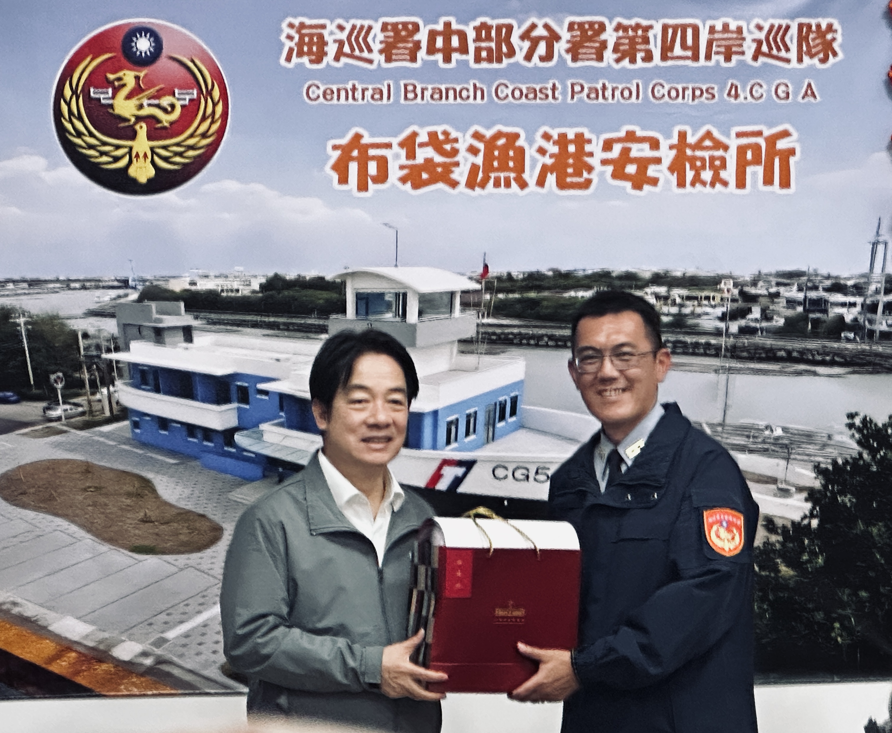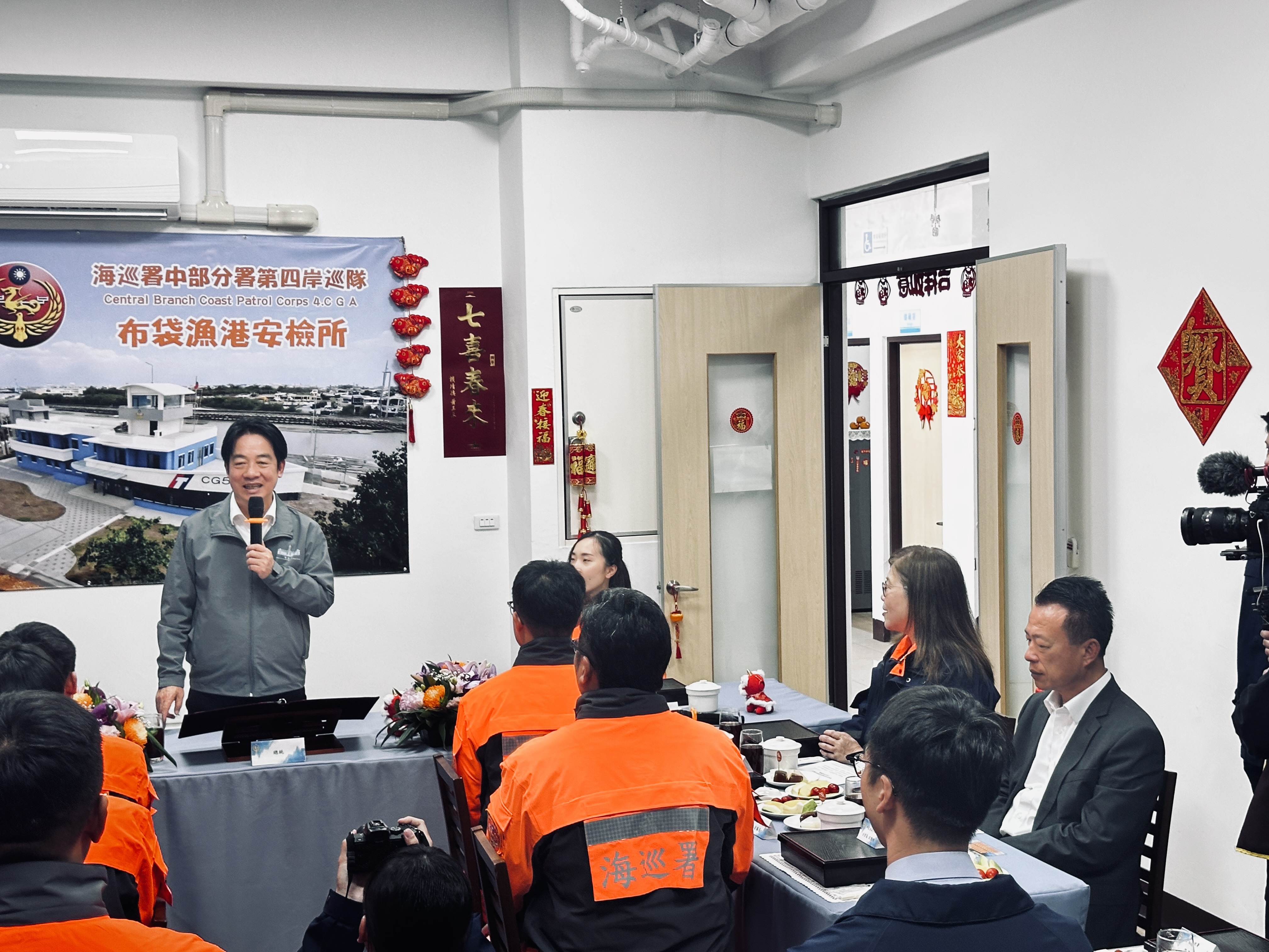 第四岸巡隊表示,總統賴清德抵達布袋安檢所後,首先由中部分署分署長王正信進行簡報安檢所興建歷程與建築特色,所長林凱杰說明港區安全維護、岸際巡查及查緝勤務概況,並實地參觀廳舍設施、與同仁共進午餐話家常,現場由總統頒發加菜金與福袋祝福,氣氛溫馨熱烈,也為春節前夕增添濃濃年味。