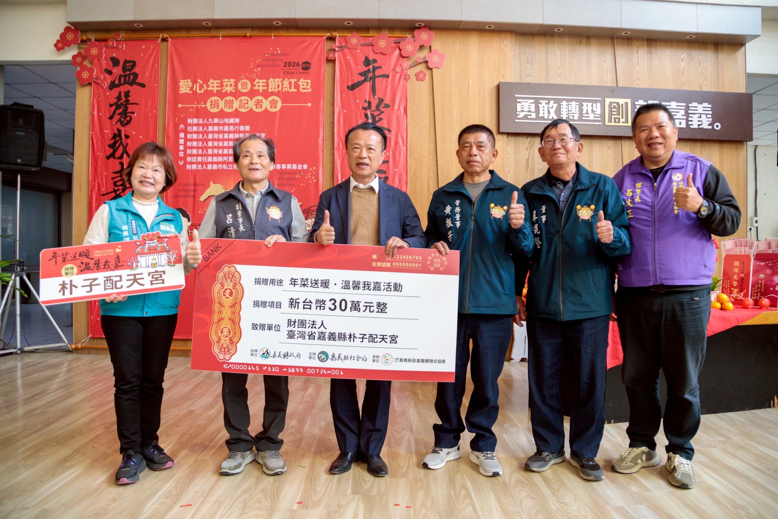 縣府表示,今年活動由九華山地藏庵、新港奉天宮、朴子配天宮、民雄鄉大士爺廟、嘉邑行善團社會福利慈善事業基金會、阿里山茶葉生產合作社及福添福社會福利慈善事業基金會等單位共同捐助,共募集1,500份年菜與年節紅包及活動經費,總價值約405萬元。