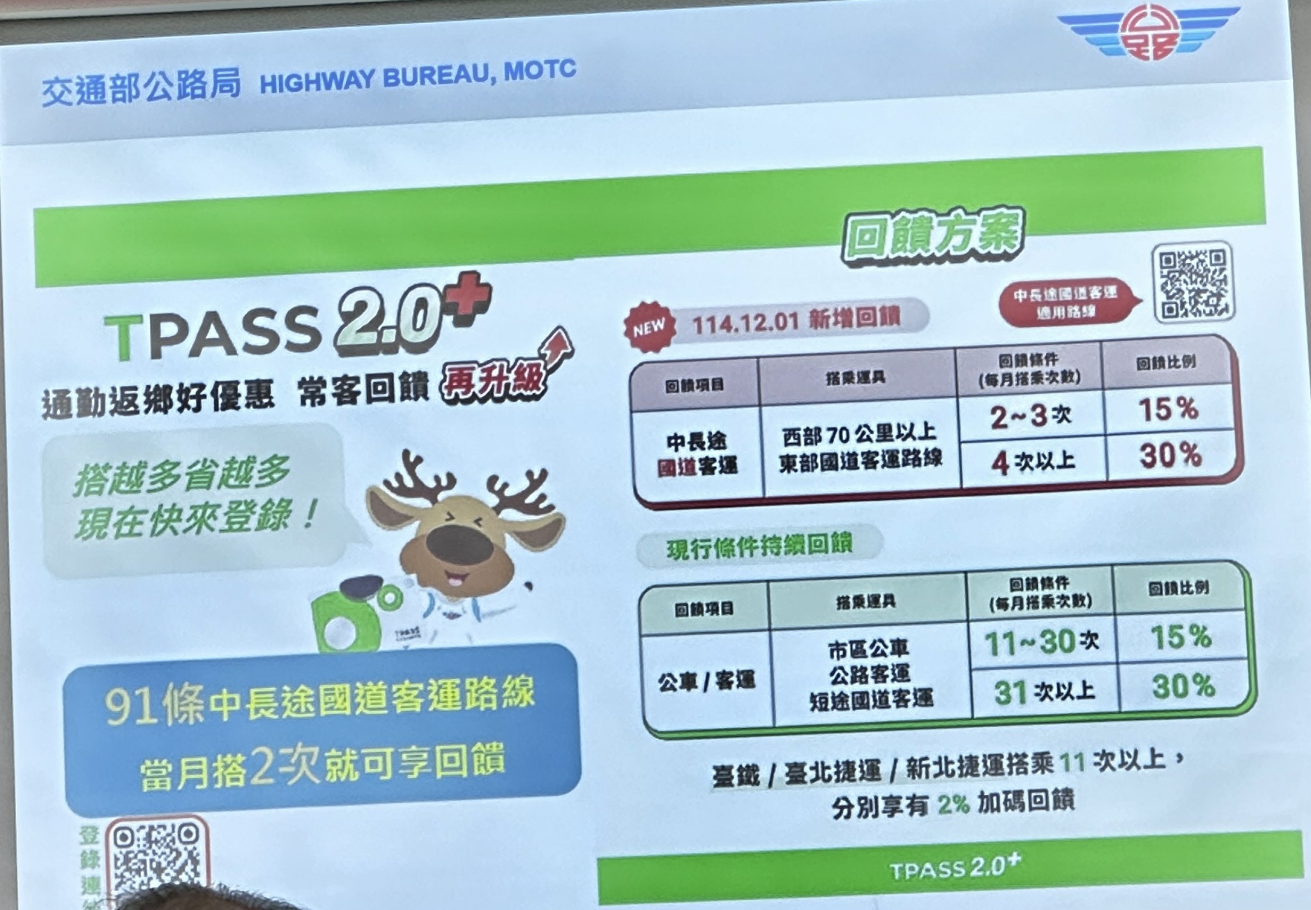 公路局表示,本局推出春節交通優惠措施:國道客運票價6折,TPASS 2.0會員加碼最高享42折;國道客運、高鐵、台鐵轉乘在地公路或市區客運10小時內享一段票或基本里程免費;指定幸福巴士免費搭乘。