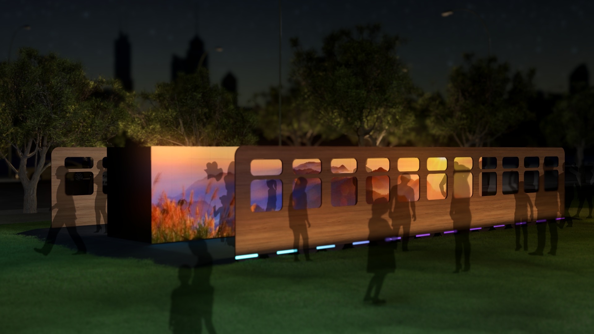 縣政府說,「時光歸鄉・希望無限列車」以嘉義火車車廂為靈感,運用雙面LED光牆,營造彷彿穿越時空的光影廊道,呈現啟程與返鄉的情感連結,喚起民眾對家鄉的記憶與期待。