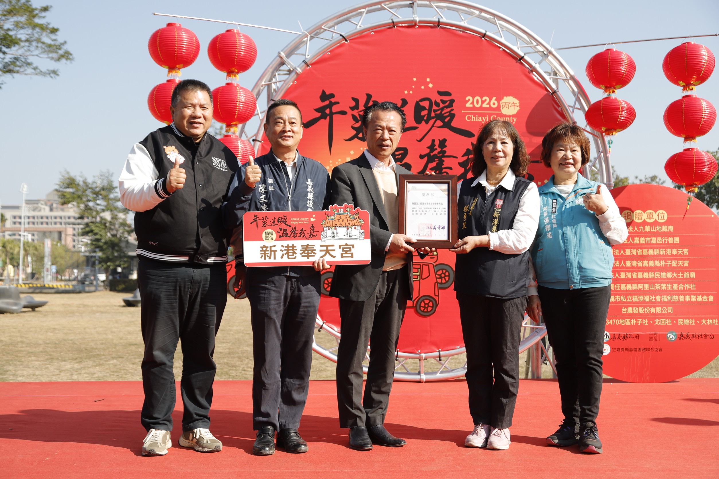 翁章梁表示,表示今年每戶將收到一份年菜及2包合計1,400元的紅包,感謝各單位不離不棄的支持,他誠摯致贈感謝狀,他強調,嘉義縣正處於「黃金十年」的關鍵成長期,期待鄉親在迎接繁榮的同時,能將「進步的力量」延伸至弱勢角落,化作溫馨的實際行動。