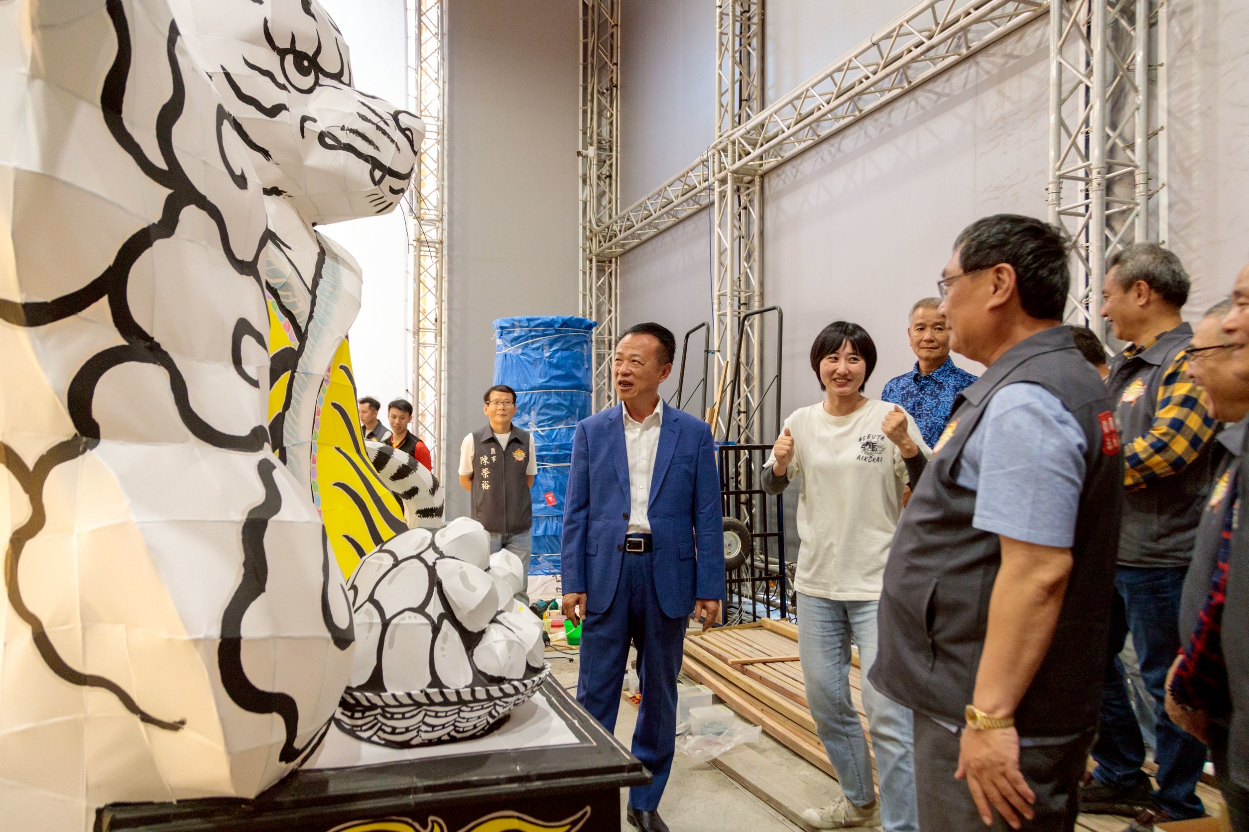 【特派員林昱宏嘉義報導】2026台灣燈會將於3月3日至15日盛大登場,嘉義縣政府攜手中華文化總會展開跨國合作,邀請來自日本青森的專業睡魔師來台駐地創作,取材朴子配天宮所奉祀的樸仔媽、千里眼、順風耳將軍與虎爺,打造大型睡魔燈組,縣長翁章梁21日下午邀配天宮董事長蔡承宗及董監事團隊前往展區,實地欣賞製作過程。