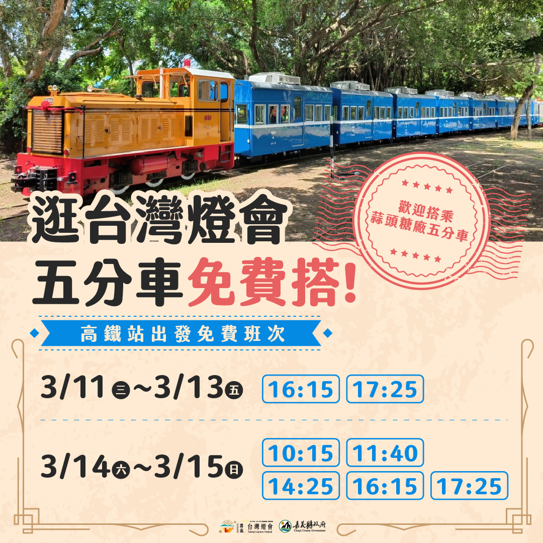 縣政府表示,提醒民眾,免費班次為高鐵站出發至蒜頭糖廠的單程服務,建議民眾提早到站候車並配合現場人員引導,共同維護搭乘秩序,歡迎遊客把握燈會期間,搭乘五分車感受燈會與糖業文化交織的魅力。