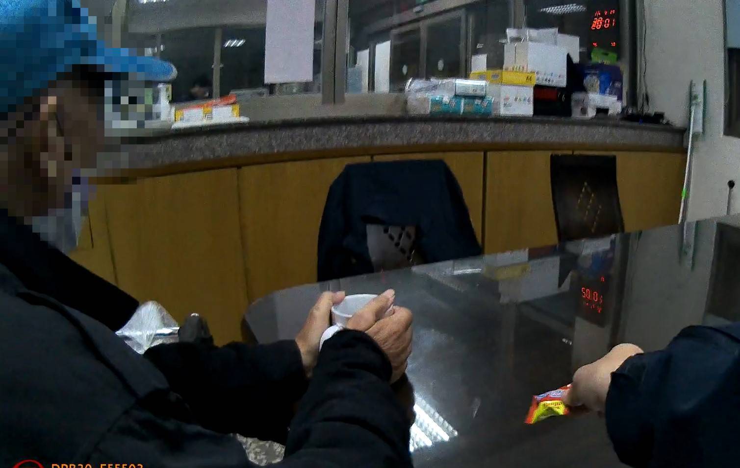 家屬向警方表示,父親平日清晨常外出散步,因此一開始並未起疑,但當天遲遲未歸,讓家屬十分擔心。受理報案後,警員簡志龍立即調閱周邊監視器畫面,發現老翁拄著步行器獨自行走,畫面一路追蹤至某處公車站牌附近後消失,研判老翁可能搭乘公車離開。簡員隨即擴大調閱沿線監視器,並親自前往轄內各公車站牌周邊實地查找。經過耐心搜尋,終於在一處公車站牌附近,發現一名拄著步行器、神情迷惘、緩步行走的長者。上前關懷詢問後,確認正是家屬焦急尋找的老翁。考量夜間天氣轉涼,簡員先將老翁安全載返派出所,由同行警員鄭巧希貼心提供熱飲與休息空間,並立即通知家屬前來接回。