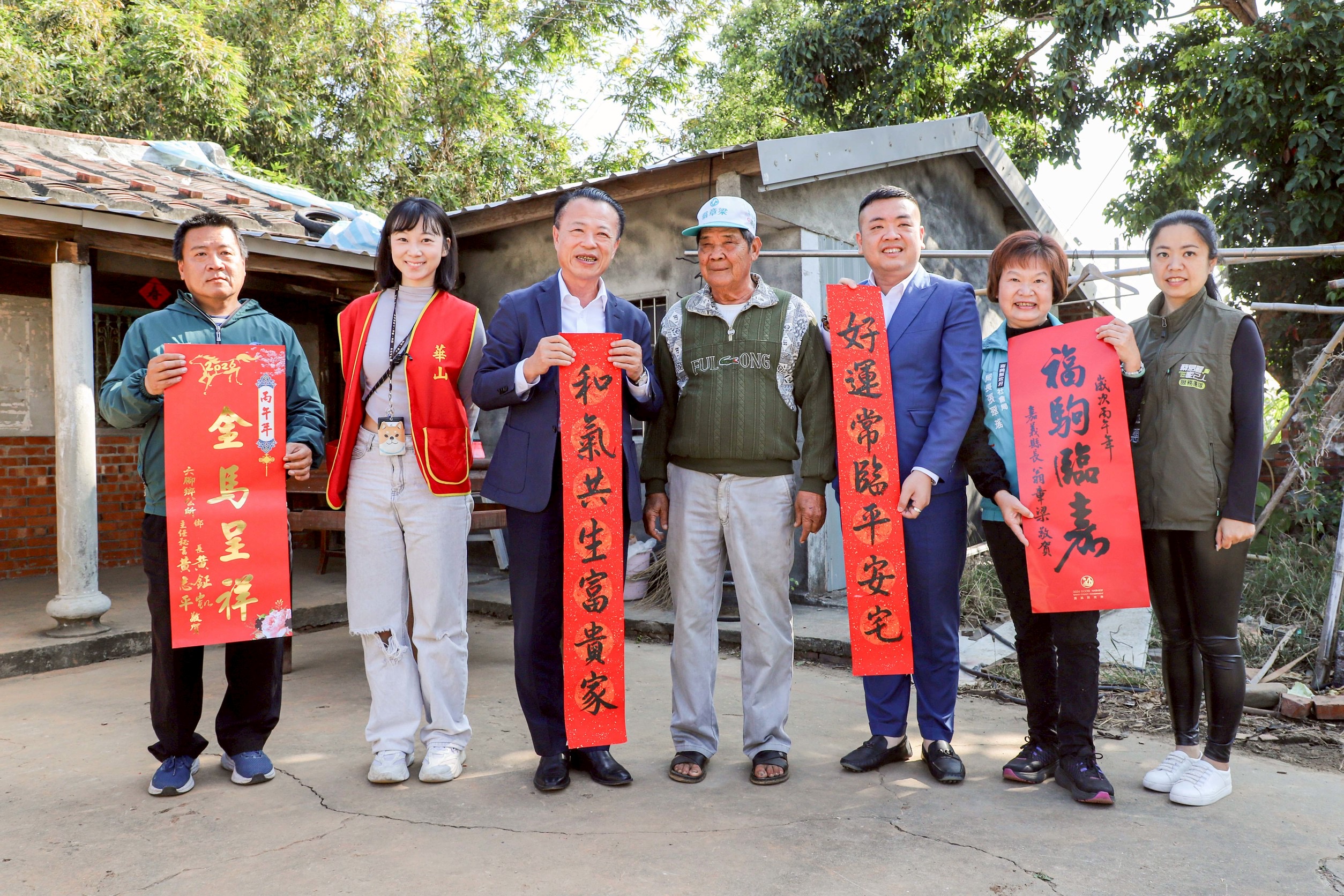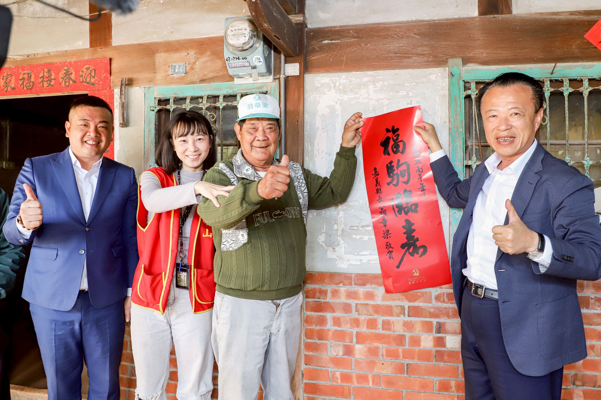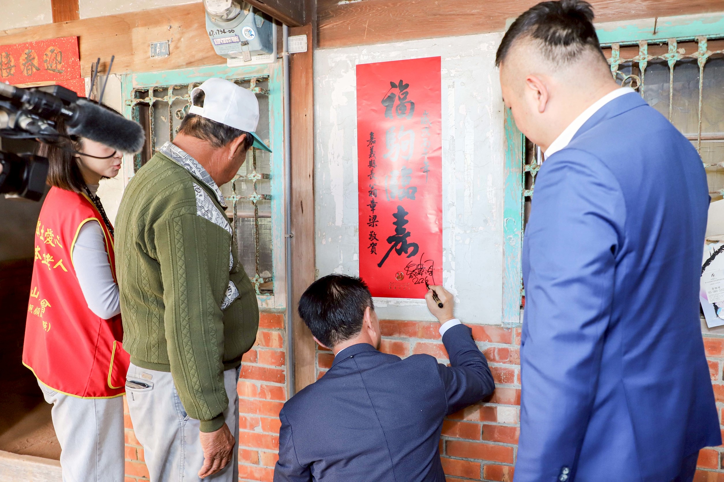 【特派員林昱宏嘉義縣報導】春節將至,為讓獨居長輩感受年節溫暖與社會關懷,嘉義縣長翁章梁29日偕同六腳鄉長黃鉦凱,前往六腳鄉探視周姓獨居長輩,致贈保暖衣物與寢具,並一同張貼「福駒臨嘉」春聯,眾人圍坐長椅話家常,氣氛溫馨。