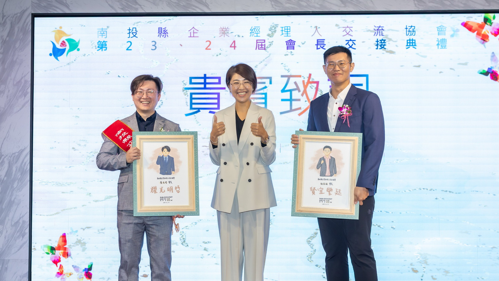 (特派員廖廣學 南投報導)南投企業經理人交流協會17日在草屯成都婚宴會館,舉辦「第23、24屆會長交接典禮」,縣長許淑華到場及與會貴賓一同觀禮。交接儀式由工策會總幹事李哲華擔任監交人,卸任理事長葉光哲將會長彩帶及印信交接給新任會長施宜廷,施會長並介紹新任幹部,過程簡單隆重。