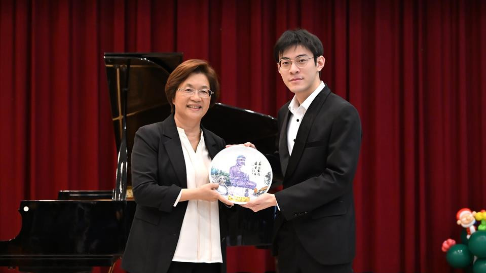 王縣長表示,來自鹿港的旅美鋼琴家張凱閔,從民生國小音樂班起步,近年獲獎無數,2023年勇奪盧布爾雅納音樂節國際鋼琴大賽首獎,更以最年輕的決賽選手贏得2024年第21屆里茲國際鋼琴大賽第4獎與皇家利物浦愛樂協會獎,極為不易。並在2021跟2025年,兩度入圍華沙蕭邦國際鋼琴大賽第2輪決賽。很高興邀請到凱閔回來分享,期盼讓同學了解,在追求成功的過程中,如何克服困難與挫折;也希望協助同學領略,要站上國際舞台,需要具備哪些條件。