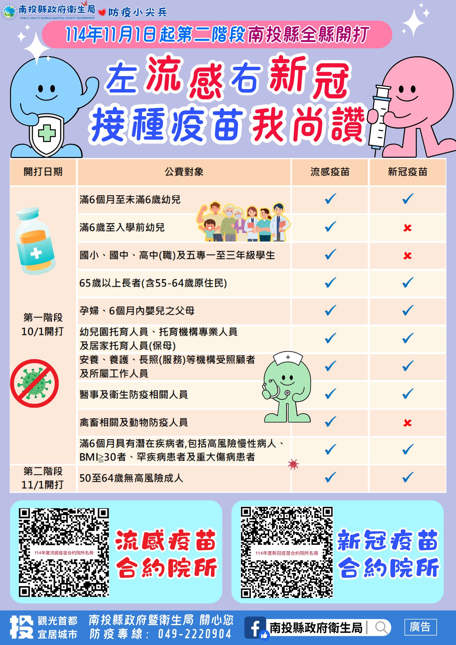 衛生局呼籲,隨著連假將至,人際互動頻繁,傳播風險上升,民眾務必防範呼吸道傳染病,並持續留意流感及新冠併發重症發生風險,若出現呼吸困難、呼吸急促、發紺、血痰、胸痛、意識改變、低血壓等危險徵兆,應儘速就醫以及時治療,並提醒長者、幼兒及慢性病患等高風險族群,本縣疫苗即將用罄,請儘速完成流感及新冠疫苗接種,獲得保護力,降低感染後發生重症和死亡之風險。並仍應保持良好衛生習慣,如勤洗手、配戴口罩及注意咳嗽禮節,共同守護自己與家人的健康,迎向安心平安的春節。有關疫苗接種相關資訊及合約醫療院所名冊均置於衛生局網站(傳染病防治專區)網址:http://www.ntshb.gov.tw,接種疫苗前,請民眾先洽詢各鄉鎮市衛生所及合約醫療院所,或撥打衛生局專線2220904洽詢。