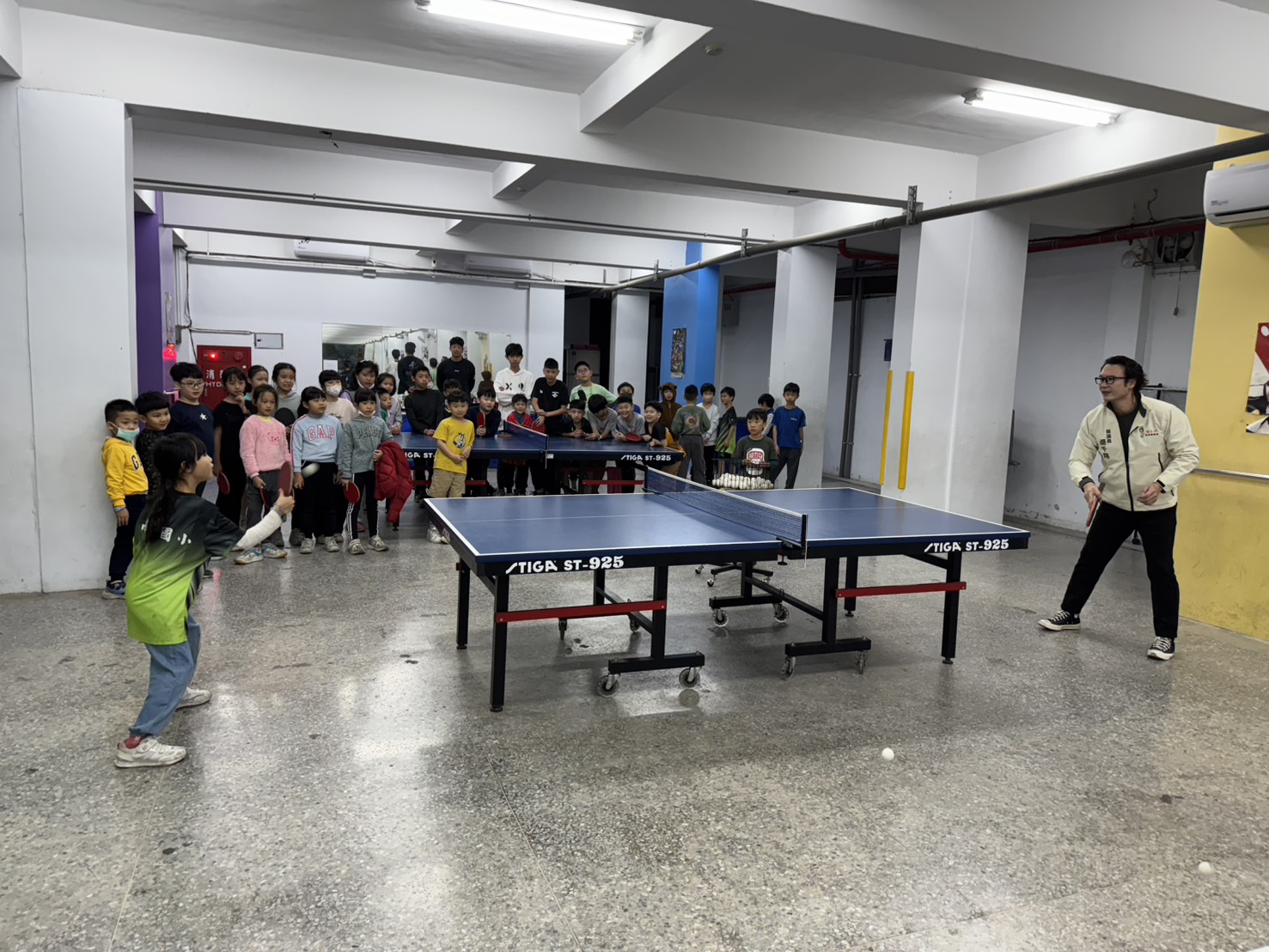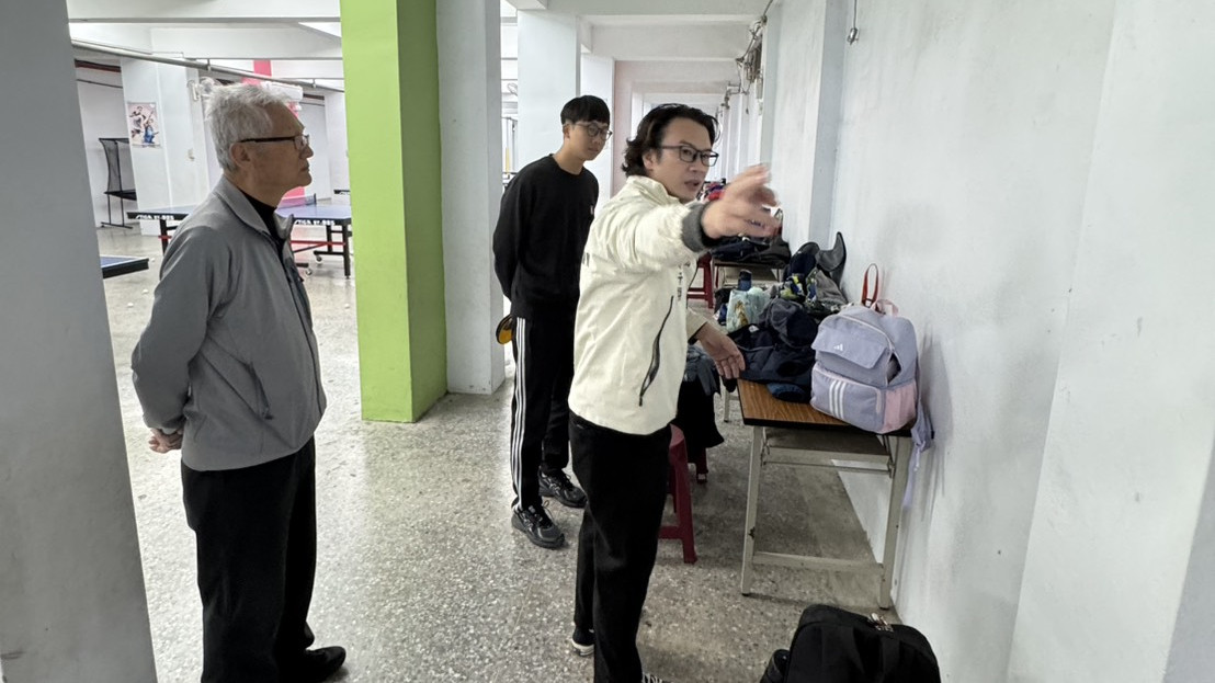 現場實地了解之後,簡千翔議員更主動邀請桌球隊學生進行友誼交流。小球員們見到議員親切下場,紛紛興奮應戰,雙方你來我往、切磋球技,場邊歡笑與加油聲不斷。議員賽後笑稱:「小朋友的技術比我好多了!看到他們對桌球的熱情,更讓我們堅定要支持學校改善設施。」