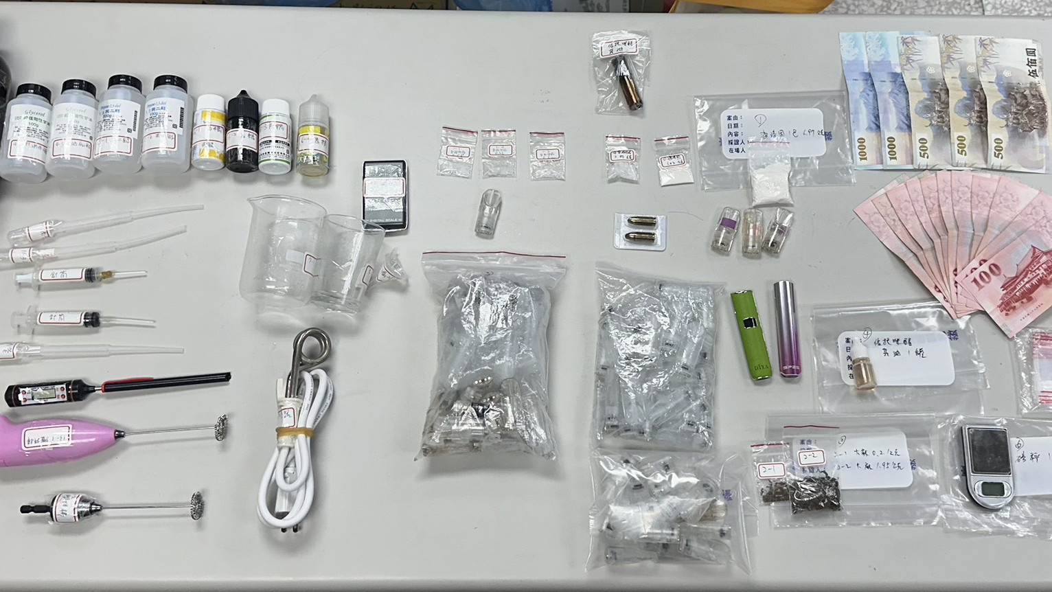 據警方調查,楊姓犯嫌(41歲)在大臺中兜售第一級毒品海洛因及第二級毒品安非他命,楊嫌生性多疑,不僅頻繁更換使用車輛,亦刻意規避警方查緝,增加蒐證難度。待蒐證完備,向臺灣臺中地方法院聲請搜索票獲准,於114年9月執行搜索,於租屋處及車輛上查扣楊嫌違法持有海洛因2包(毛重:8公克)、大麻(毛重:2.15公克)、安非他命(毛重:2.03公克)、依拖咪酯煙彈17顆、煙油2瓶、空煙彈、分裝袋1批、丙二醇、丙三醇、燒杯、針筒、滴管、攪拌棒、溫度計、電子磅秤、手機、子彈2顆及販毒所得新臺幣4600元等贓證物,楊嫌顯有進行依拖咪酯分裝的事證,全案經檢察官偵結後,依違反毒品危害防制條例、槍砲彈藥刀械管制條例等罪嫌提起公訴。
