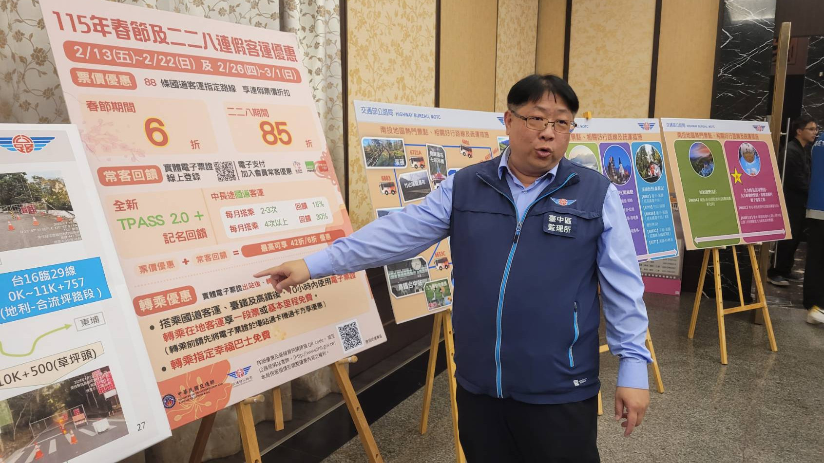 南投監理站陳洽文站長表示,春節及二二八連假期間疏運,請民眾多加利用公共運輸工具,可有效減少道路阻塞,並達成節能減碳之效,亦可利用「iBus 公路客運」APP查詢國道客運、公路客運及部分縣市客運班車資訊。