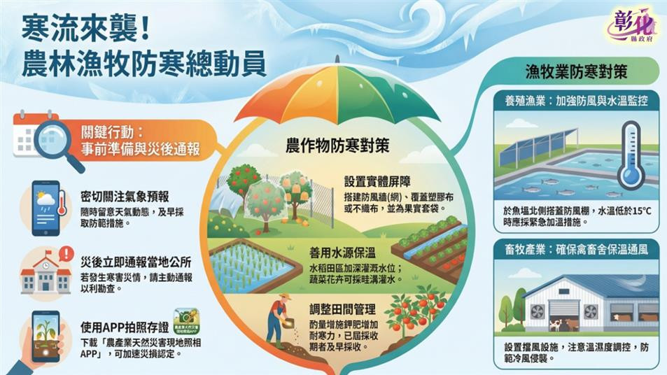 (記者邱暐茹 彰化報導)依據中央氣象署預報資料,7日起受鋒面及寒流影響,氣溫將開始下降,先濕冷後轉乾冷;最冷時間落在2月8日(日)至2月9日(一)清晨,農林漁牧須嚴防寒害發生;2月10日下週二起寒流減弱,氣溫才會明顯回升。彰化縣長王惠美叮嚀農友務必注意自身保暖,並避免在清晨氣溫最低時出門,在寒流來襲前先做好以下的農作物相關防寒措施: