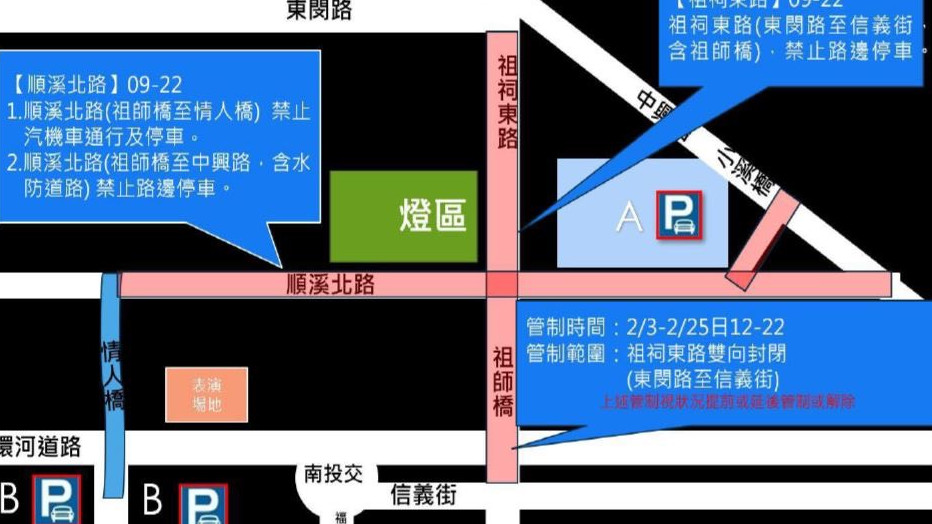 五、春節重點期間(2月14日至2月22日):12時至22時視車流狀況祖祠東路(東閔路至信義街)進行交通管制。