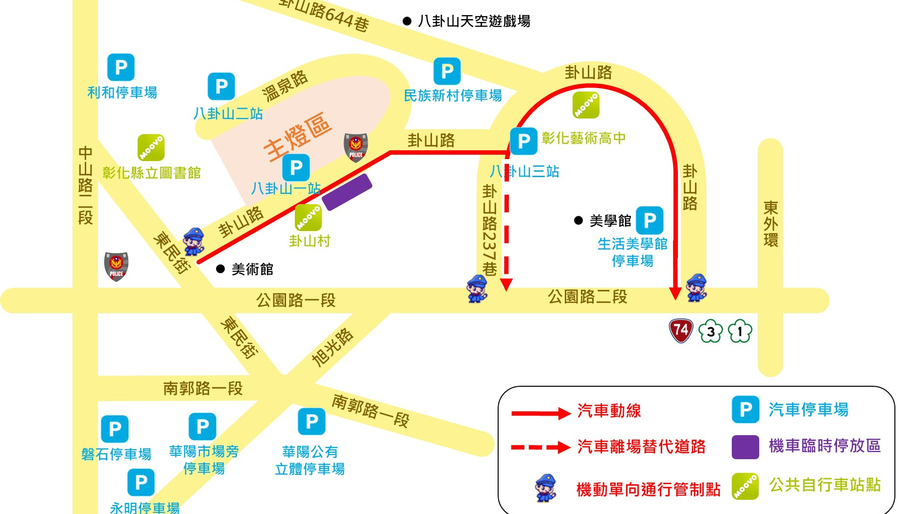 如要前往民族新村停車場或八卦山天空遊戲場者,請由卦山路進出並原路往返,勿依導航行駛中山路二段644巷。該路段道路狹窄、坡度陡峭且不易會車,請配合現場交通引導,確保行車安全。