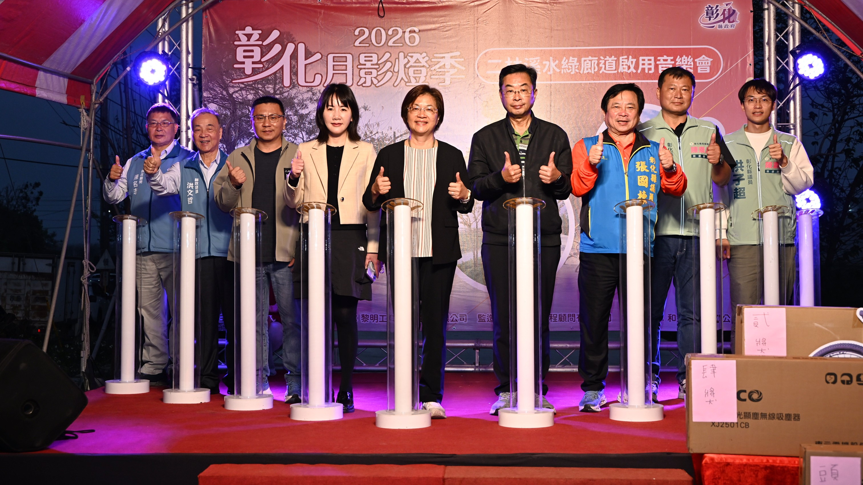 (記者邱暐茹 彰化報導)彰化縣政府推動「二林溪排水(忠孝橋至信義橋)周邊景觀改善工程」,已於日前完工,將傳統排水渠道改造為綠意盎然的休閒綠帶,並於今(1)日在二林溪畔舉辦水岸音樂會,彰化縣長王惠美出席,與鄉親互動同樂。配合生肖馬年,現場致贈「2026月影燈季」限量版Rody小提燈,民眾反應熱烈。王縣長表示,縣府挹注2,796萬元改善二林溪水岸廊道,感謝議長謝典霖及所有議員對預算的支持,共同打造優質水岸環境。