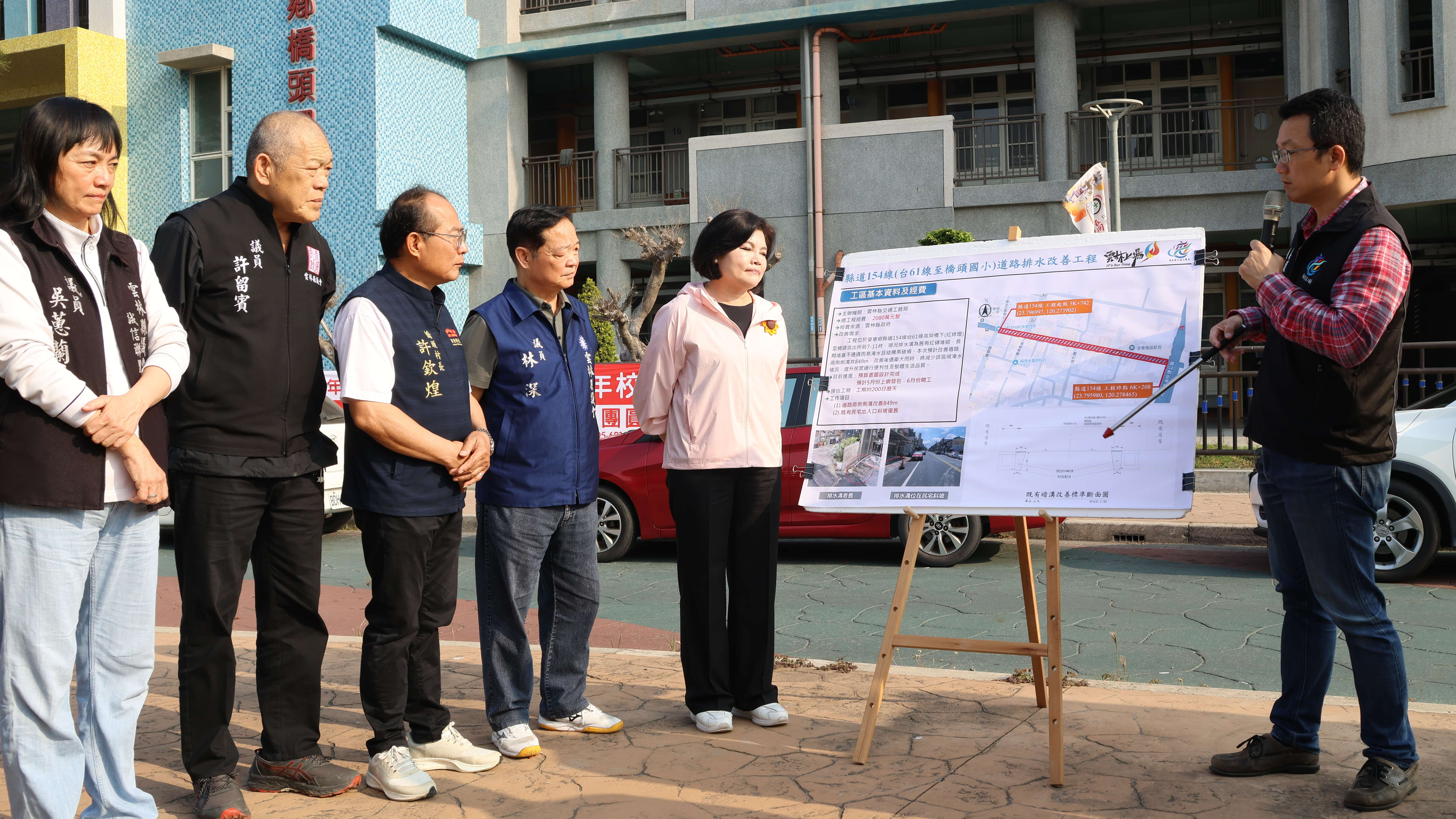 張麗善指出,縣道154線排水改善工程總長約849公尺(兩側合計),將新設排水溝渠並加大側溝斷面,工程經費約2,078萬9,000元,預計6月開工、工期200天,並將依地方建議強化7-11路口轉彎處排水順暢度,提升整體排水效能。