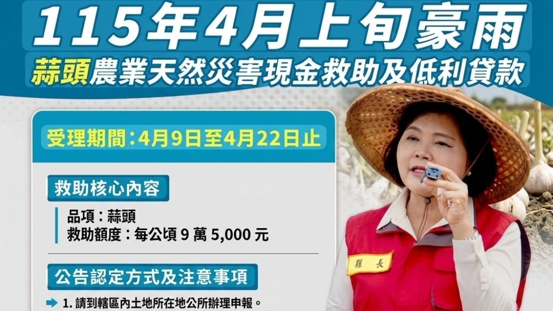 縣長張麗善感謝中央體恤農民,並提醒種植大蒜農友,如災損達20%以上,應於4月9日至4月22日期間,向土地所在地公所提出申請,以維護自身權益、減輕經濟損失。