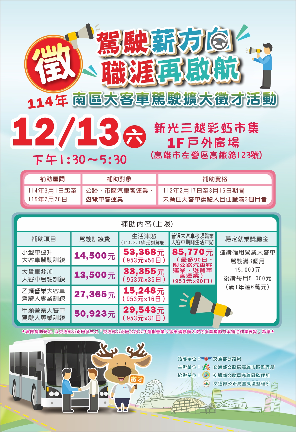 (記者楊秋季 南高報導)為協助客運業者延攬及培育駕駛人才,交通部與公路局持續推動「營業大客車駕駛擴大徵才就業獎勵方案」,高雄市區監理所將於114年12月13日(星期六)下午1時30分至5時30分,在高雄新光三越左營店彩虹市集1樓戶外廣場舉辦南區大客車駕駛擴大徵才活動,現場提供多達400個職缺,歡迎有志之士投入運輸業的行列。