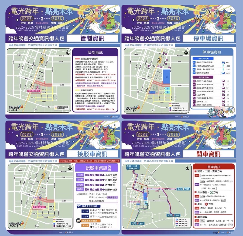 縣警局呼籲,前往田徑場民眾多搭乘高鐵、臺鐵轉接駁車,前往劍湖山跨年或住宿旅客請提早於下午入園,夜間賞煙火可改至華山地區或台3線、古坑中山路段,以避開交通尖峰,共同迎接平安新年。