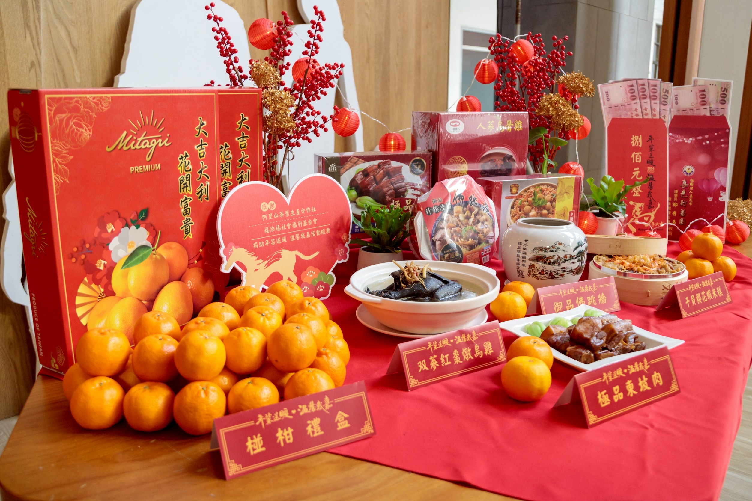 縣府說,此外,台農發公司捐贈1,500盒椪柑禮盒,國際扶輪社3470地區朴子社、北回社、民雄社及大林社也捐贈毛帽與保溫瓶各600份,讓受助家庭在享用年菜之餘,更添一分安心與喜氣。