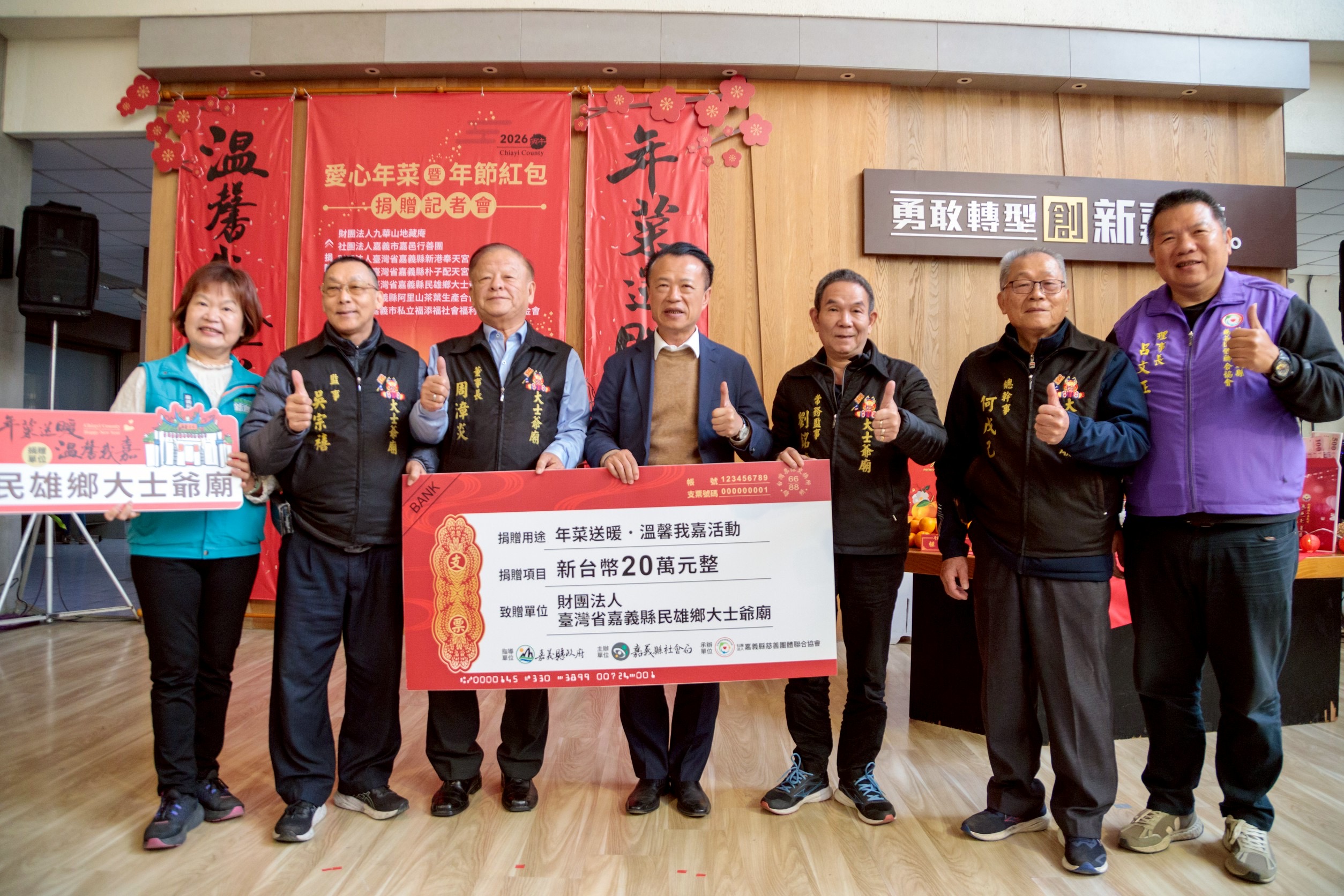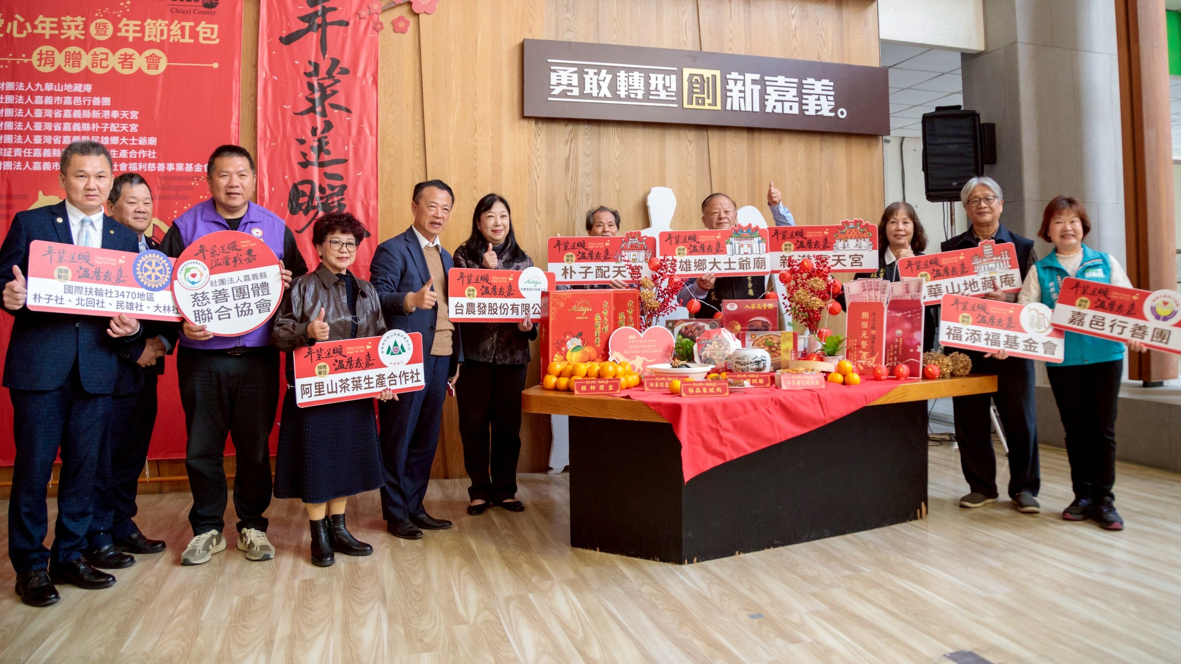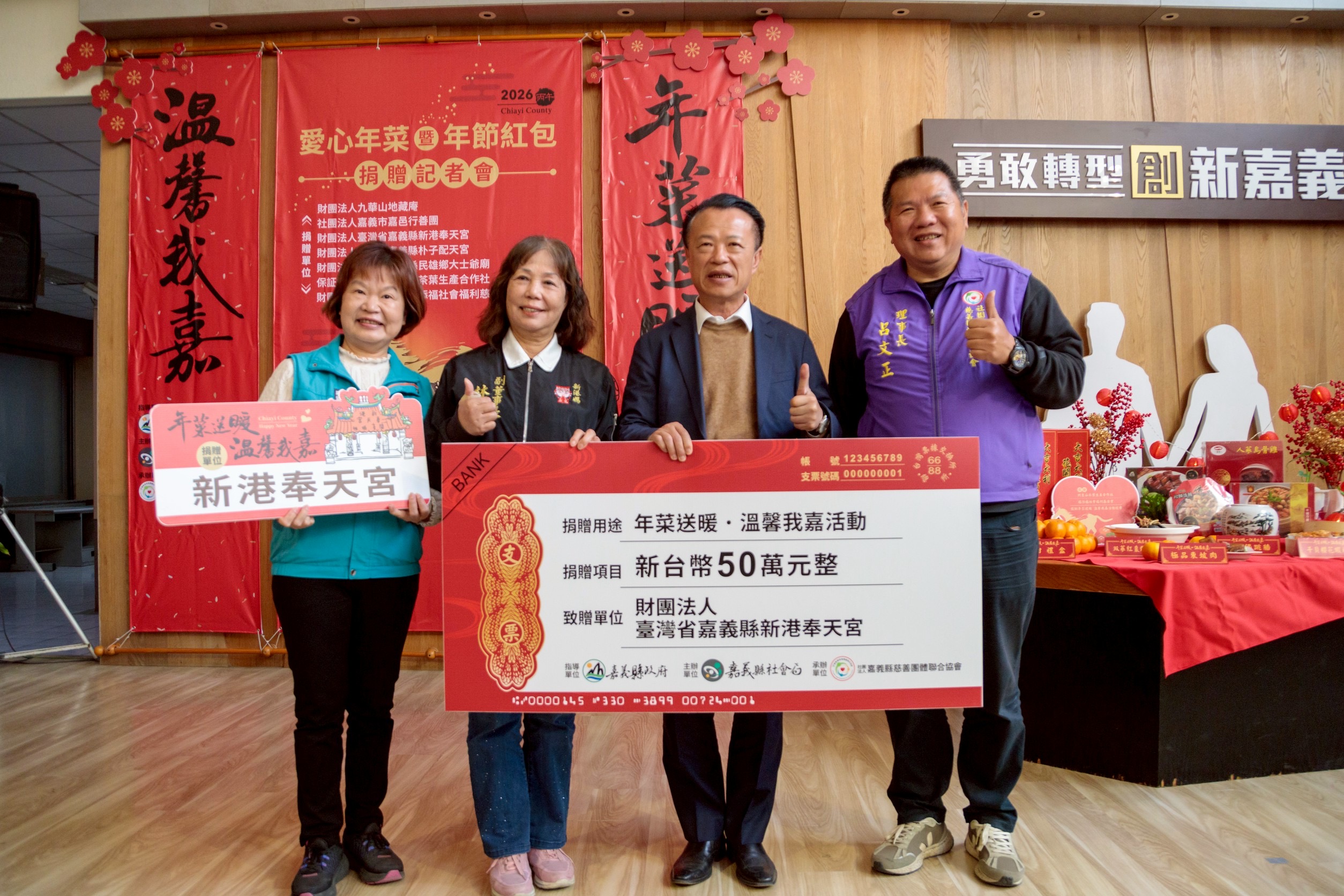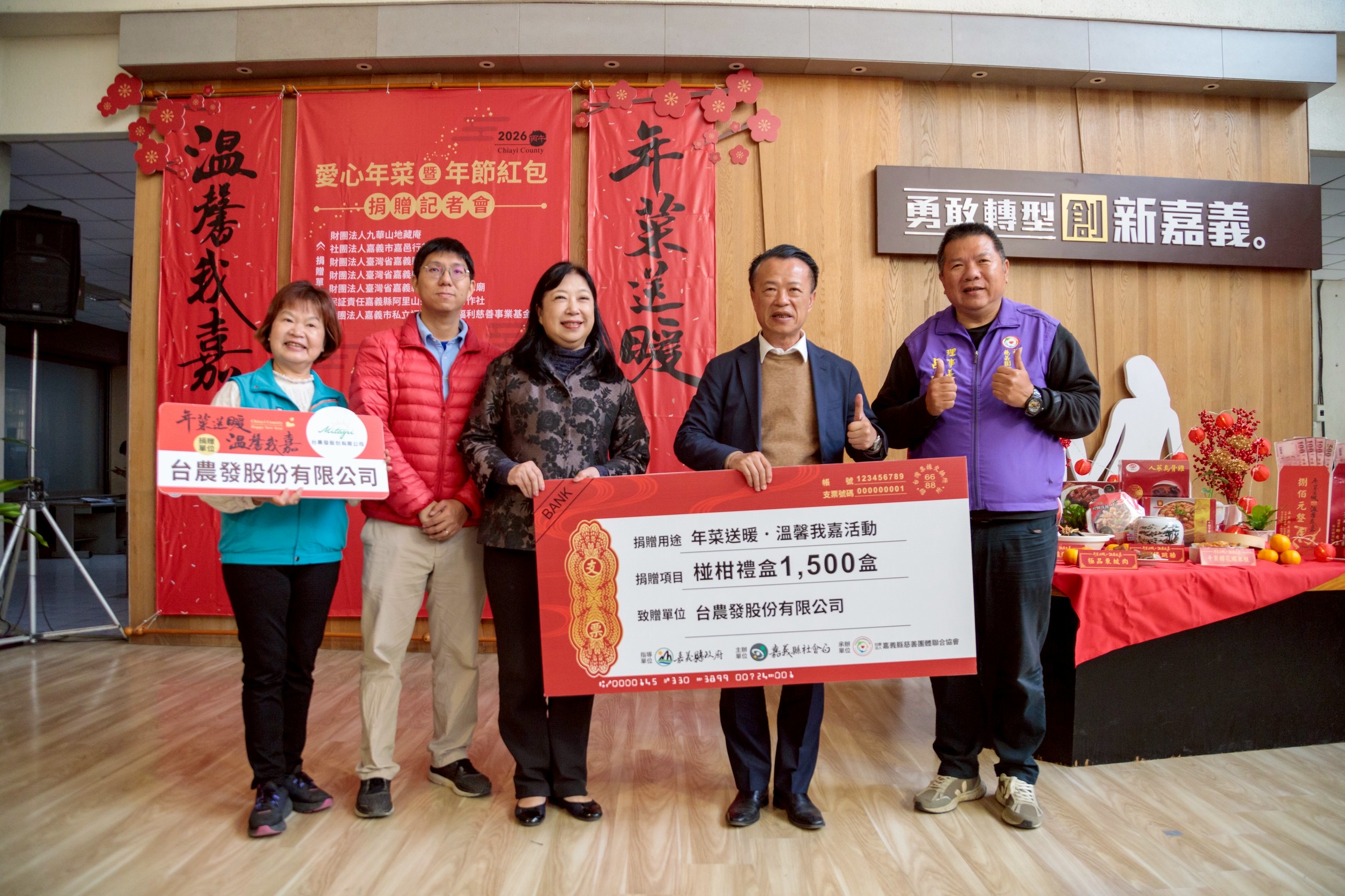 縣府表示,今年活動由九華山地藏庵、新港奉天宮、朴子配天宮、民雄鄉大士爺廟、嘉邑行善團社會福利慈善事業基金會、阿里山茶葉生產合作社及福添福社會福利慈善事業基金會等單位共同捐助,共募集1,500份年菜與年節紅包及活動經費,總價值約405萬元。