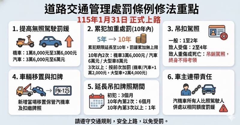 雲林縣警察局指出,此次修法大幅加重無照駕駛處罰力道,重點包括: