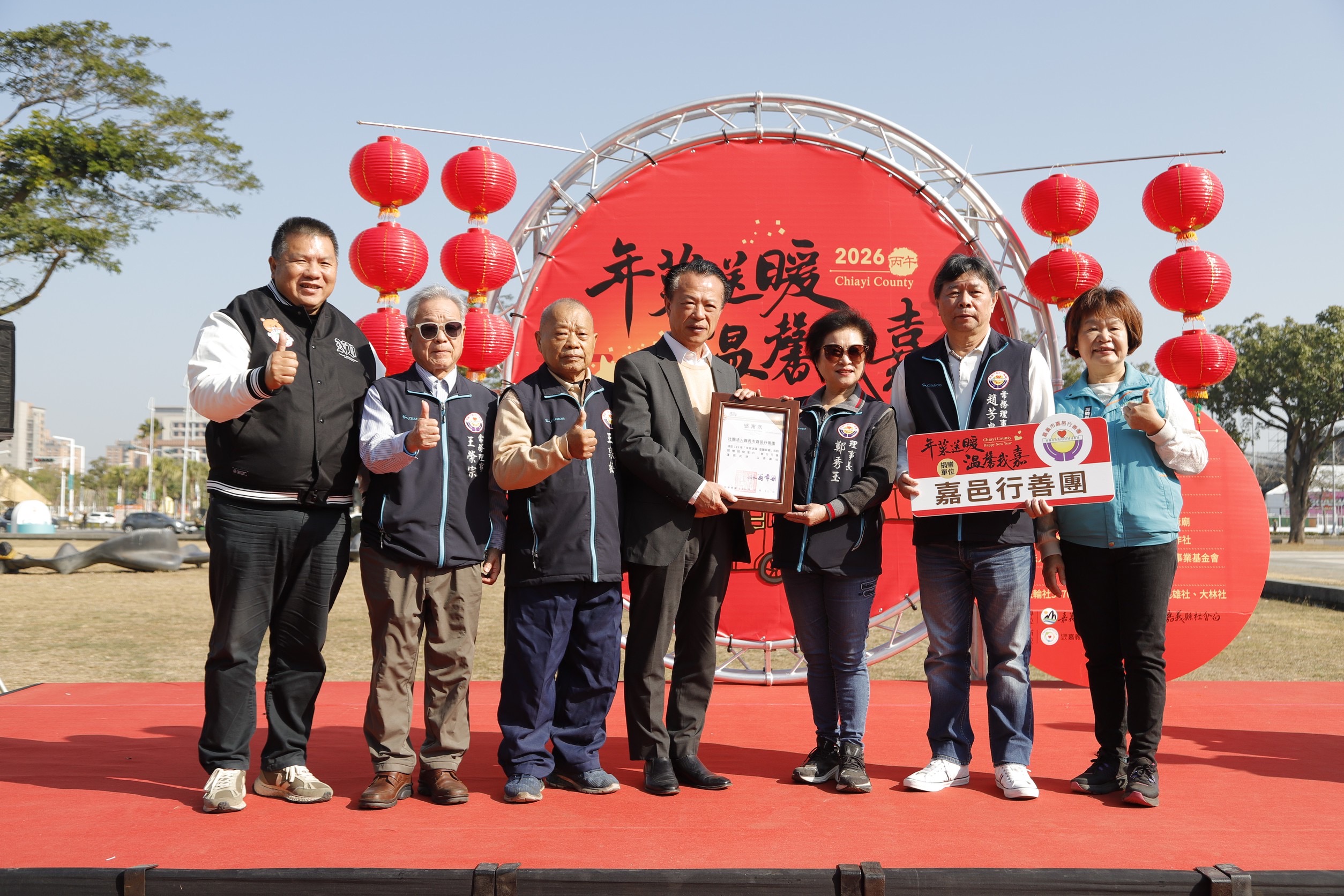 翁章梁表示,表示今年每戶將收到一份年菜及2包合計1,400元的紅包,感謝各單位不離不棄的支持,他誠摯致贈感謝狀,他強調,嘉義縣正處於「黃金十年」的關鍵成長期,期待鄉親在迎接繁榮的同時,能將「進步的力量」延伸至弱勢角落,化作溫馨的實際行動。