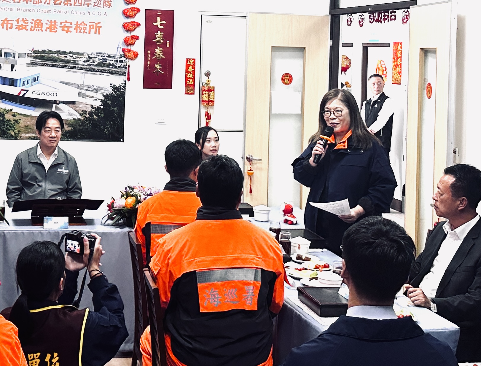 第四岸巡隊表示,總統賴清德抵達布袋安檢所後,首先由中部分署分署長王正信進行簡報安檢所興建歷程與建築特色,所長林凱杰說明港區安全維護、岸際巡查及查緝勤務概況,並實地參觀廳舍設施、與同仁共進午餐話家常,現場由總統頒發加菜金與福袋祝福,氣氛溫馨熱烈,也為春節前夕增添濃濃年味。
