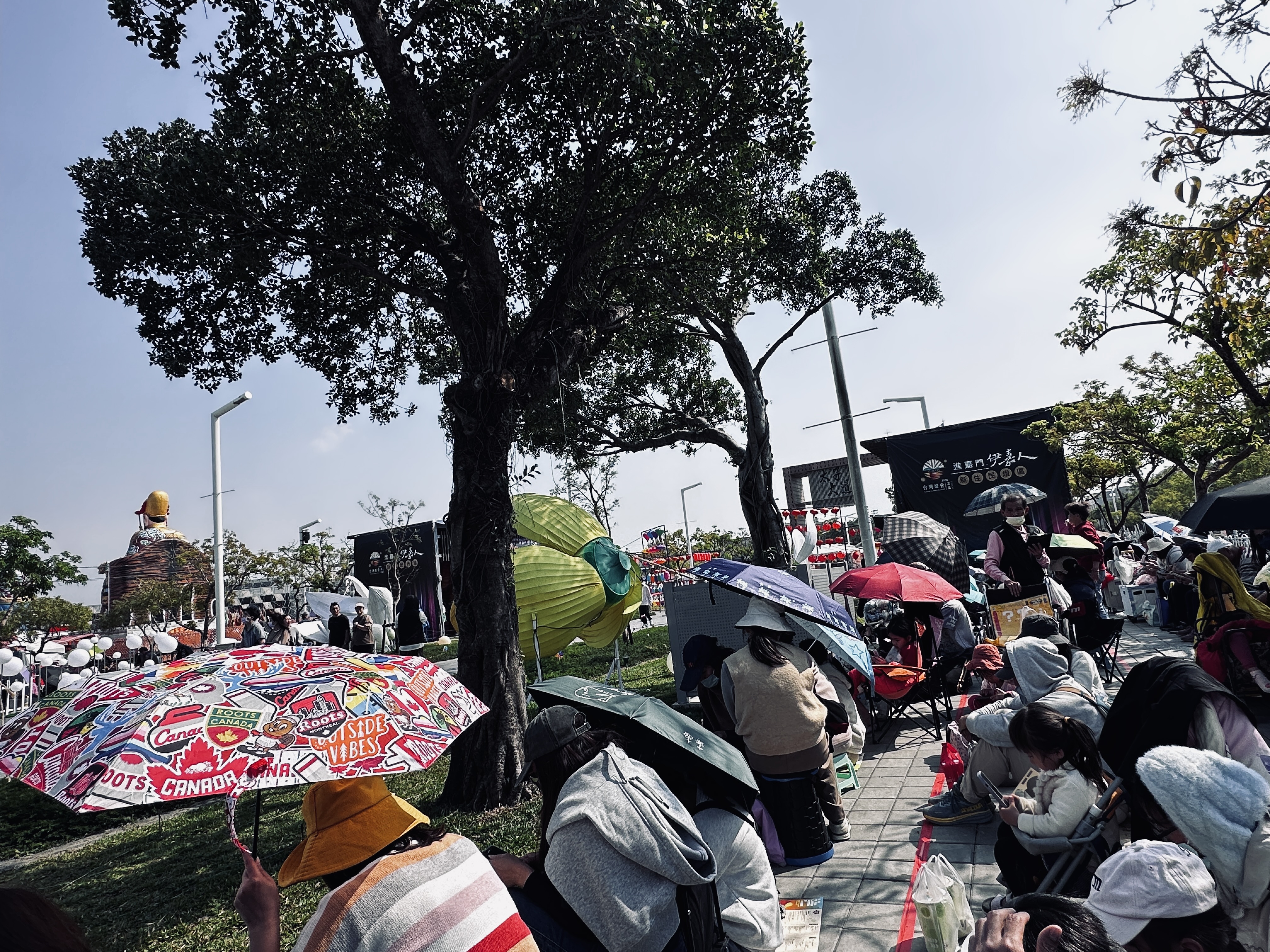 記著表示,經勘查,發現現場可見不少民眾自備小椅子、陽傘與飲料,在步道旁或樹蔭下席地而坐等待,也有親友輪流排隊守候,希望能順利領到限量提燈,排隊民眾一邊聊天、滑手機打發時間,一邊感受燈會現場熱鬧氣氛,耐心等待發放時間到來。