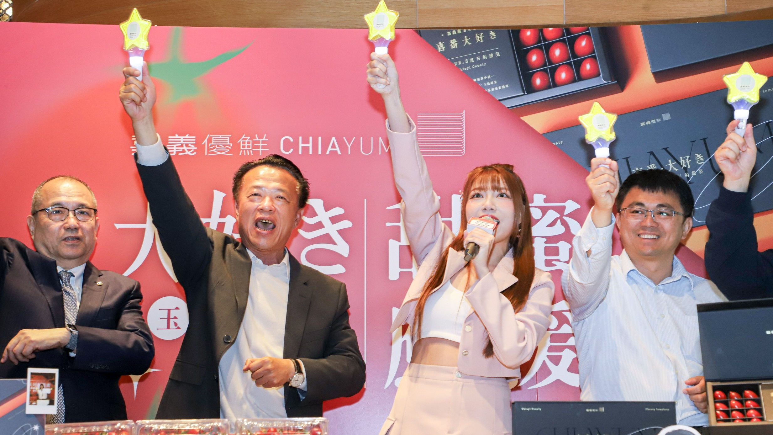 【特派員林昱宏嘉義報導】嘉義縣政府22日在台北微風百貨舉辦「玉女小番茄產季感謝祭」,縣長翁章梁結束日本山口縣推廣鳳梨行程後,返台當日隨即北上站台,攜手通路與農會代表及啦啦隊女孩共同應援,強力行銷嘉義玉女小番茄,吸引消費者目光。