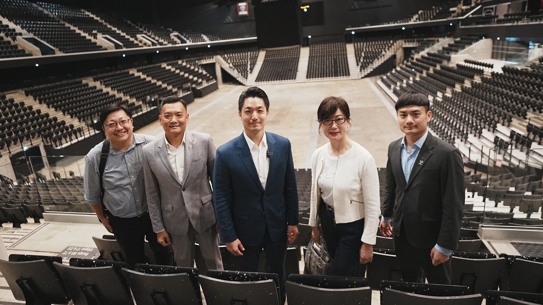蔣萬安首站在巴黎副市長Arnaud Ngatcha與駐法大使郝培芝等人陪同下介紹Adidas Arena體育館