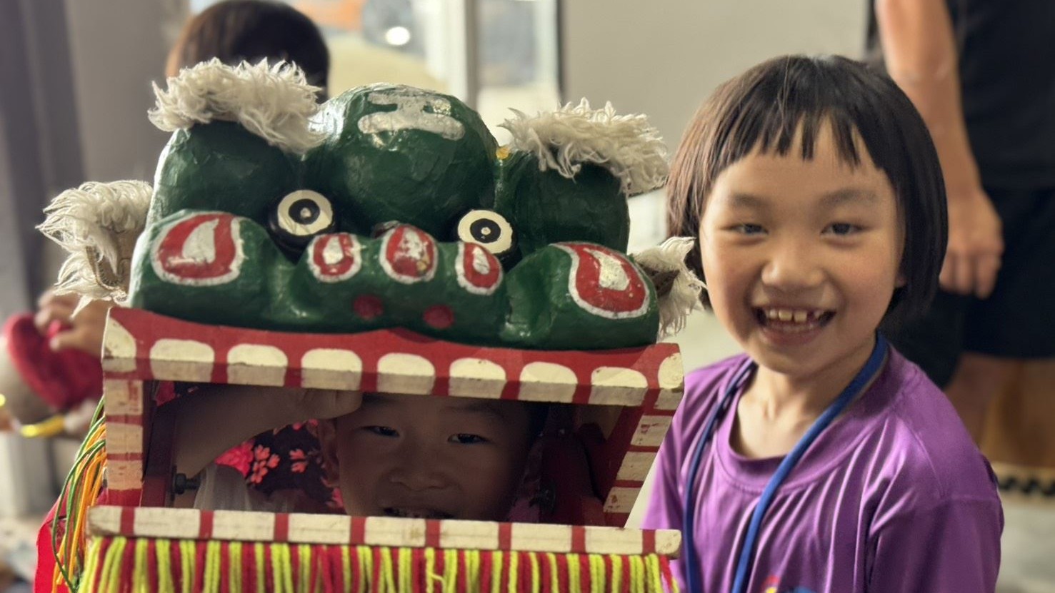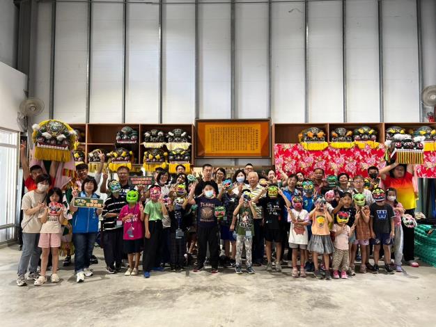 新竹縣客家武術舞獅發展協會理事長鄭香浩先說明客家方口獅的起源典故、還有親子創意獅頭彩繪,年輕學子也跟著老師傅蹲起傳統客家拳的馬步、基本防身並學習操作方口獅,在一掌一拳、進進退退之間,逐漸顯現出小小武師的架式。