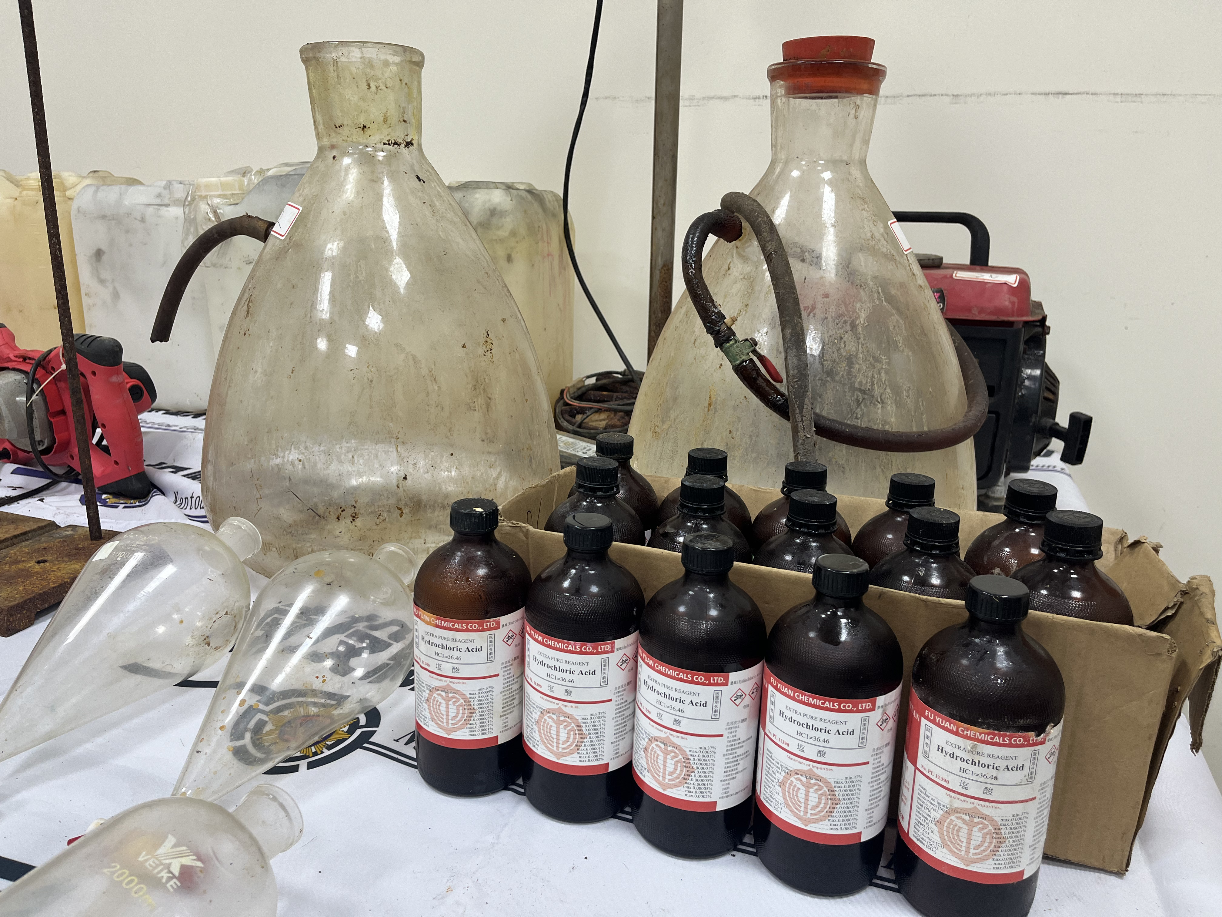 (特派員廖廣學 南投報導)南投縣政府警察局刑警大隊於113年5月間,在臺灣南投地方檢察署張姿倩檢察官指揮下,於本轄中寮鄉偏僻山區破獲一處第三級毒品「4-甲基甲基卡西酮」(俗稱喵喵)製毒工廠。當場查扣毒品成品與半成品共計達180公斤及大量製毒器具,並成功查緝製毒師傅3人到案,成功瓦解非法製毒據點。