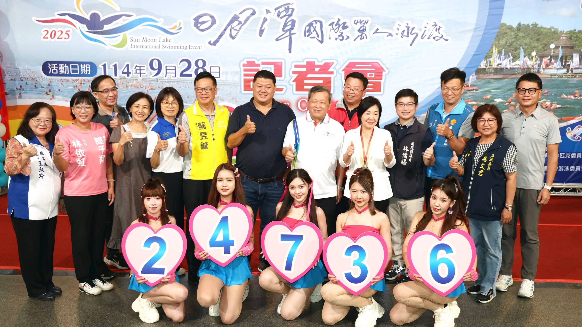 (特派員廖廣學 南投報導)縣府12日在縣府一樓大廳,舉行 2025第43屆日月潭國際萬人泳渡系列活動記者會,副縣長王瑞德偕與會來賓共同揭示,將有2萬4,736位泳士參加邁入第43年的日月潭國際萬人泳渡。王副縣長也致贈內政部空中勤務總隊、消防署特種搜救隊、維他露公司、新光人壽等贊助單位感謝狀,並由導演安景鴻分享以七位視障泳士挑戰日月潭萬人泳渡為主軸的「突破:三千米的泳氣」電影,傳遞「同心泳渡」的感動精神,包括立委游顥、縣議員林儒暘、陳宜君、蘇昱誠、南投市長張嘉哲、魚池鄉長劉啟帆、日月潭國家風景區管理處副處長湯維堯、社團法人南投縣埔里鎮四季早泳會理事長蔡幸娟都出席,並以精彩的原民舞蹈及活力少女勁舞為活動揭開序幕。