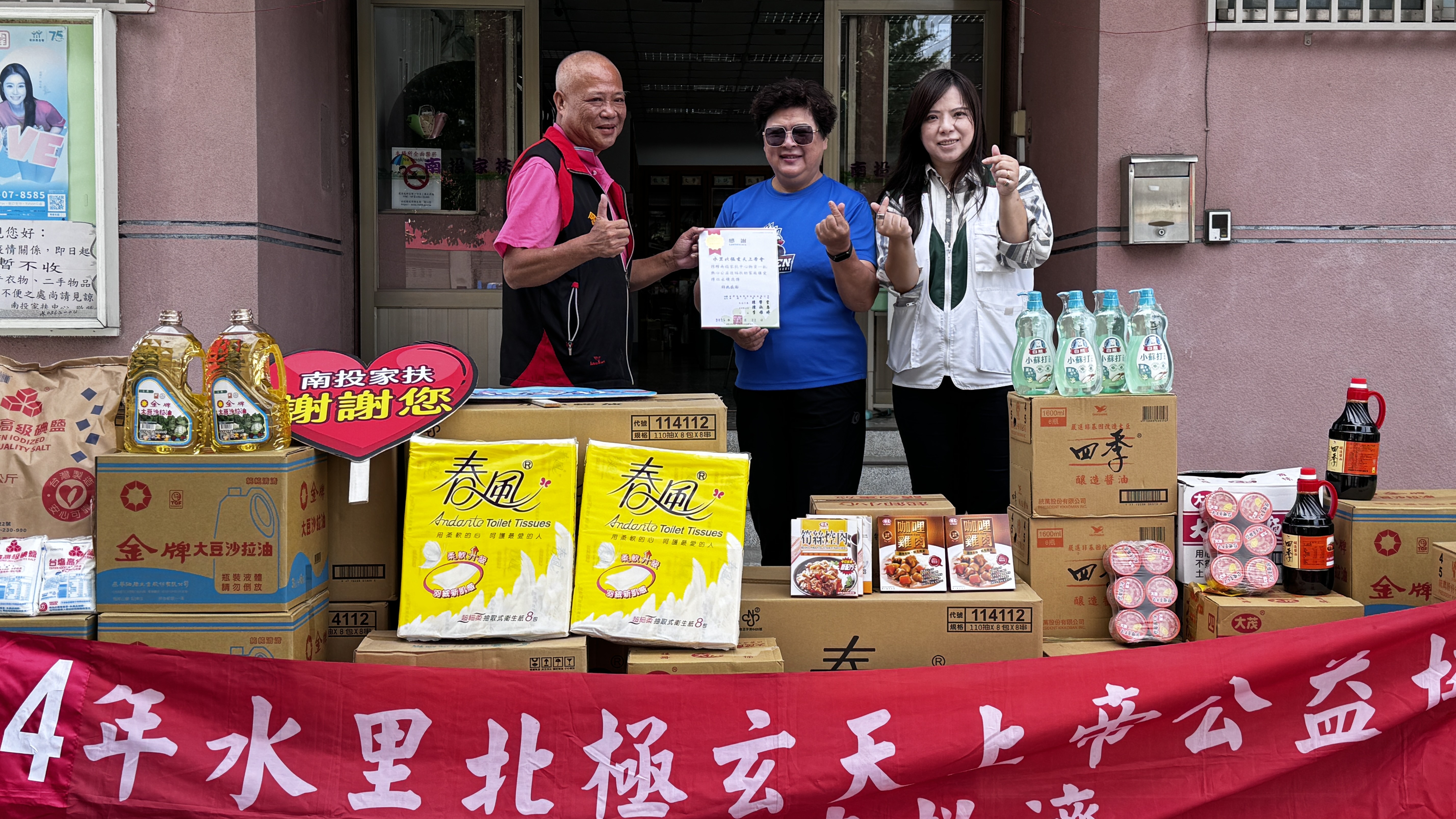 (特派員陳錦玲 南投報導) 中秋佳節將至,水里北極玄天上帝公益協會持續秉持關懷弱勢的精神,十年來依循玄天上帝旨意「拋磚引玉」,將善款挹注縣內弱勢家庭。22日由大水里區扶幼區主委暨縣議員陳淑惠、鄉民代表陳世明與前會長張衡發率領會員們,再次前往南投家扶中心捐贈愛心物資,並捐款1萬2千元,專款用於水里服務處建館基金。此舉不僅實質減輕弱勢家庭的壓力,更為縣內孩子與家庭點亮一盞希望之光。