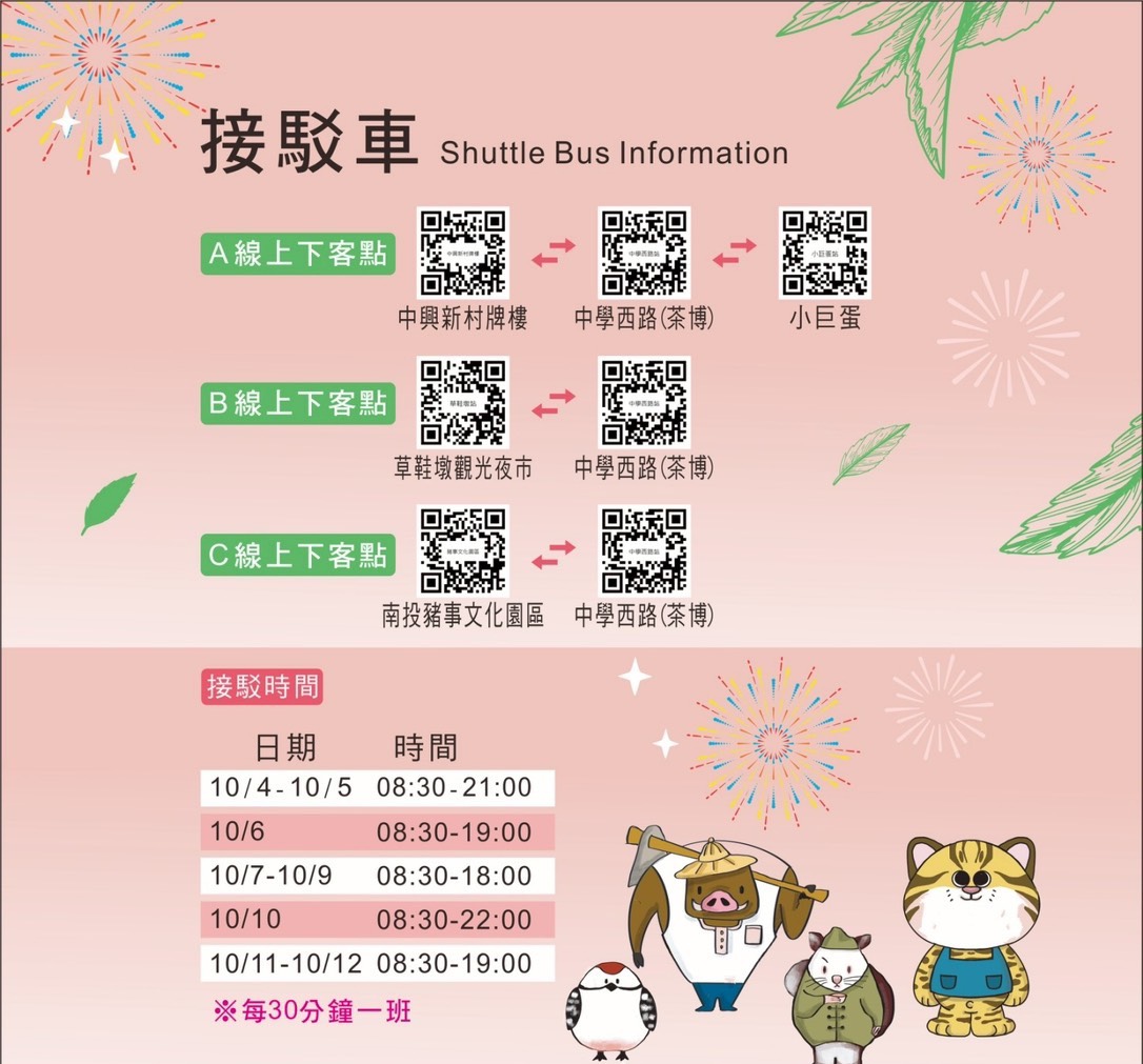 二、 接駁日期(時間):10/4-10/5 (08:30-21:00)、10/6 (08:30-19:00)、10/7-10/9 (08:30-18:00)、10/10(08:30-22:00)、10/11-10/12(08:30-19:00),每30分鐘一班。