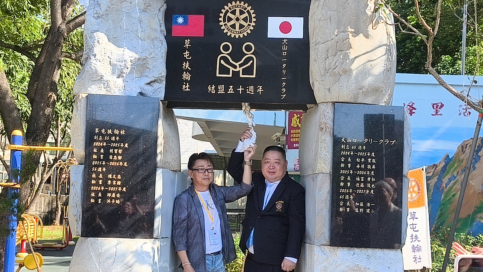 (特派員廖廣學 南投報導)草屯扶輪社與日本犬山扶輪社,14日在草屯玉峰里活動中心, 舉行50 週年「植樹立碑揭幕典禮」,鎮長簡賜勝, 草屯扶輪社長陳文忠,日本犬山扶輪社長福冨 孝弘及兩社社友共同揭牌, 象徵兩社半世紀的合作情誼與共同服務精神。