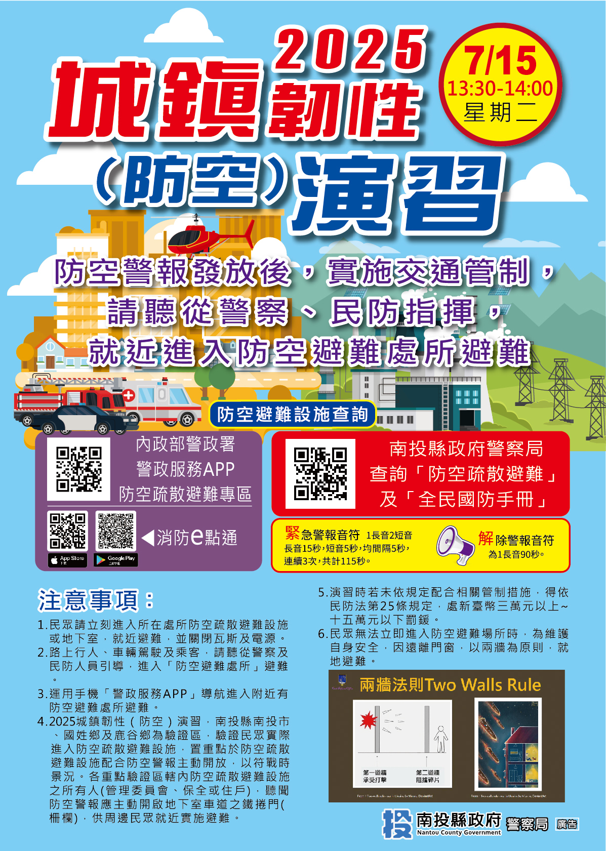 南投縣政府警察局特別呼籲民眾配合演習當日警報發放時,各商店、住戶應熄燈並關閉門窗,行人、車輛駕駛及乘客應聽從警察及民防執勤人員引導,或運用手機「警政服務APP」導航進入附近有「防空避難設備」標誌牌處所避難,切不可在街上、戶外或防空避難處所附近徘徊觀望。