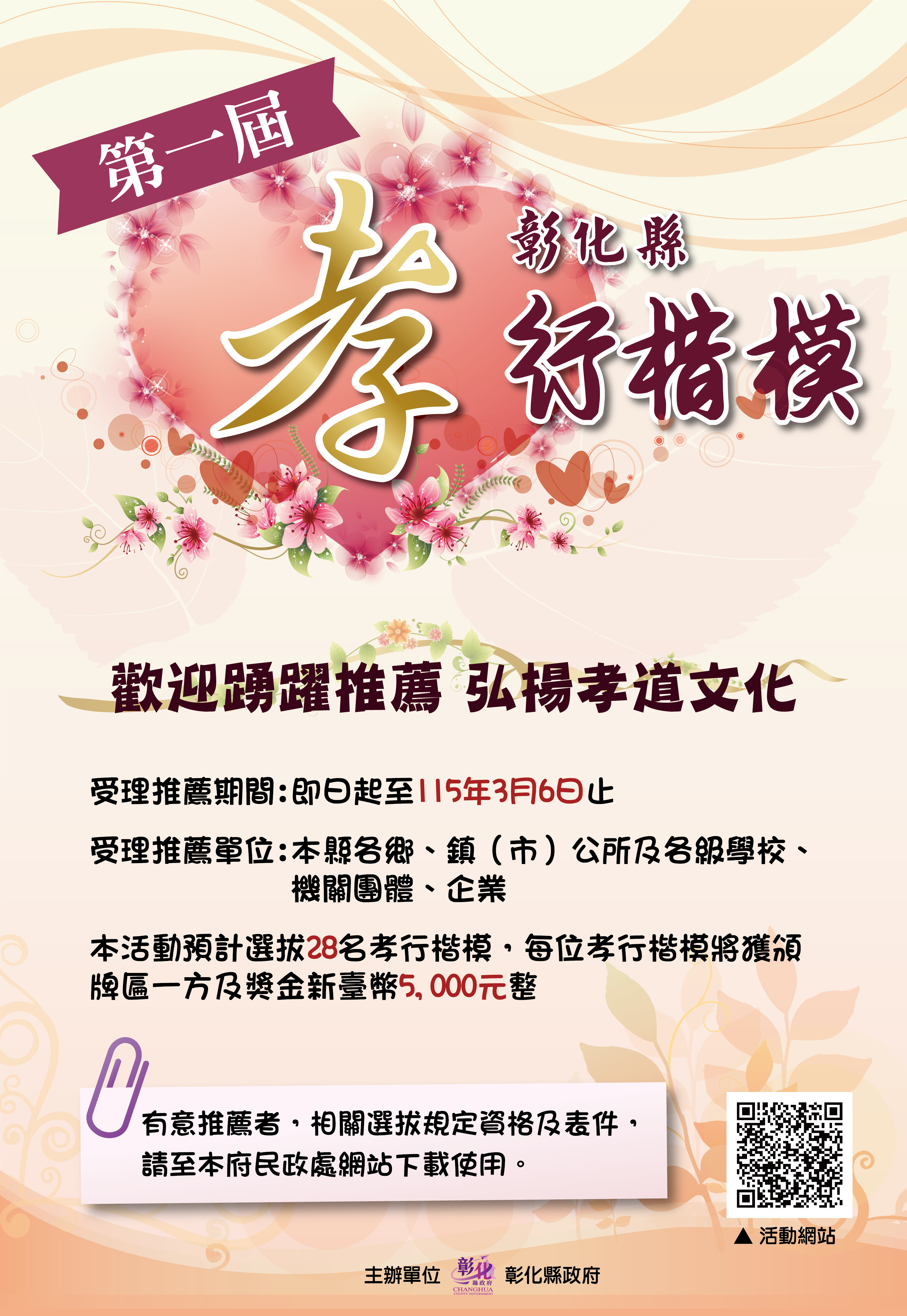 縣府表示,本次選拔作業係依「彰化縣孝行楷模遴薦審議及表揚要點」於全縣遴選出28名孝行楷模,一般民眾、村(里)長或學校教師等皆可為推薦人,於即日起至115年3月6前備妥被推薦人基本資料及具體孝行事蹟,向本縣各鄉(鎮、市)公所及各級學校、機關團體、企業提出推薦。縣府將自獲選之28位孝行楷模中,擇優推薦3位具代表性之孝行故事參選今年「全國孝行獎」,讓彰化的感人事蹟躍上全國舞台,傳遞溫暖力量。