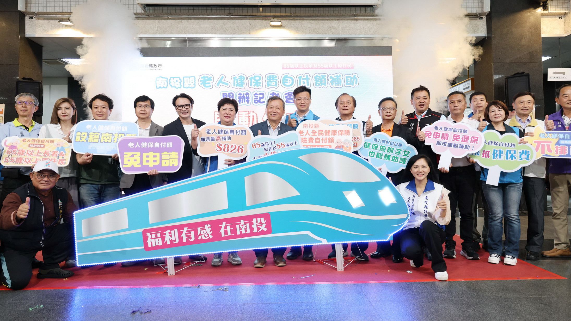 縣府24日上午在縣府一樓大廳舉辦南投縣「老人全民健康保險保險費自付額補助計畫」啟動記者會;會中,副縣長王瑞德邀請與會貴賓一同宣布,南投縣老人健保自付額補助自115年4月1日起正式實施,全面照顧設籍南投縣,年滿65歲以上長者及年滿55歲以上原住民,免申請、不排富、入籍即享福利,每月每人補助826元,年省近萬元,減輕長輩經濟負擔。