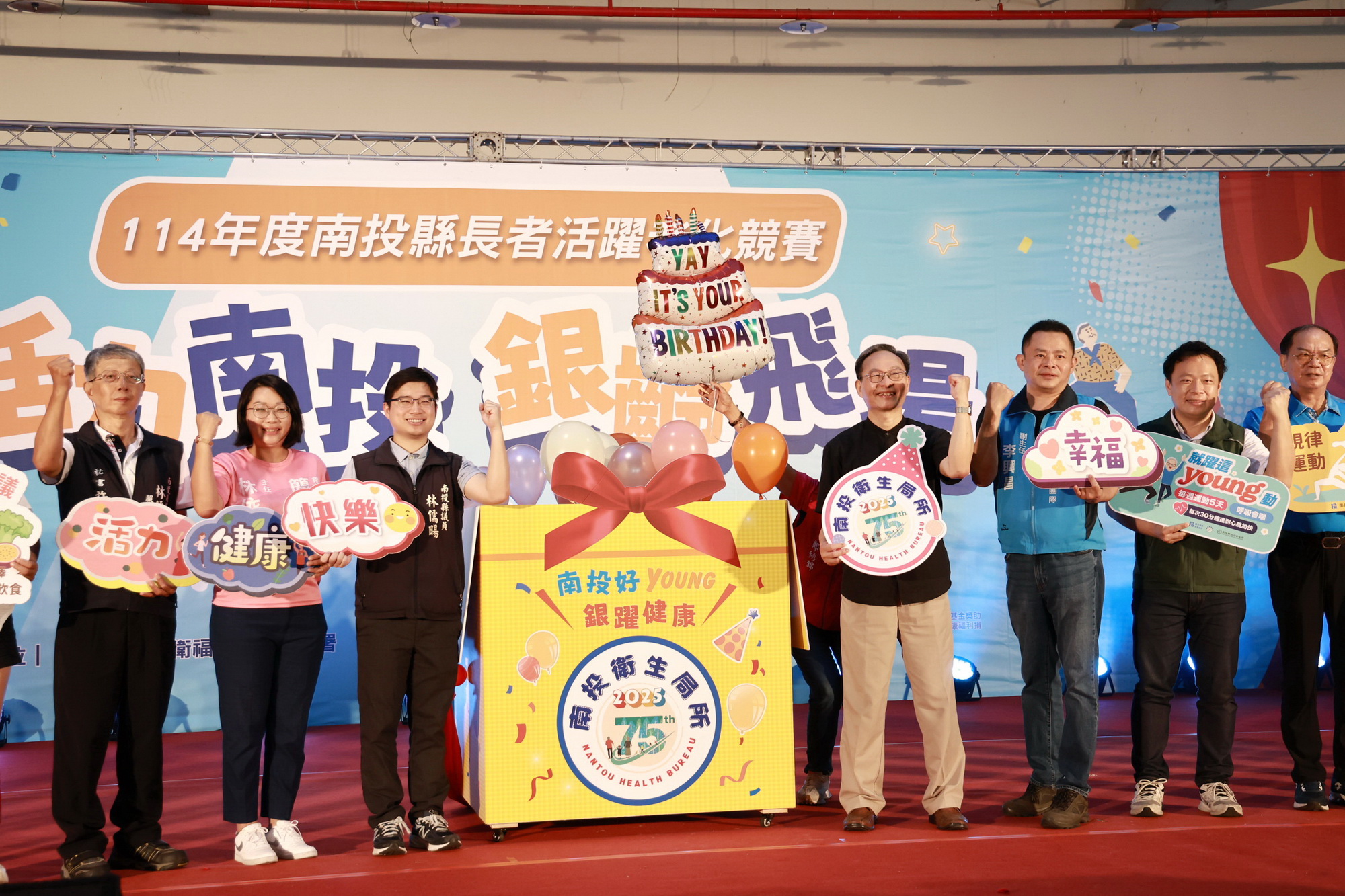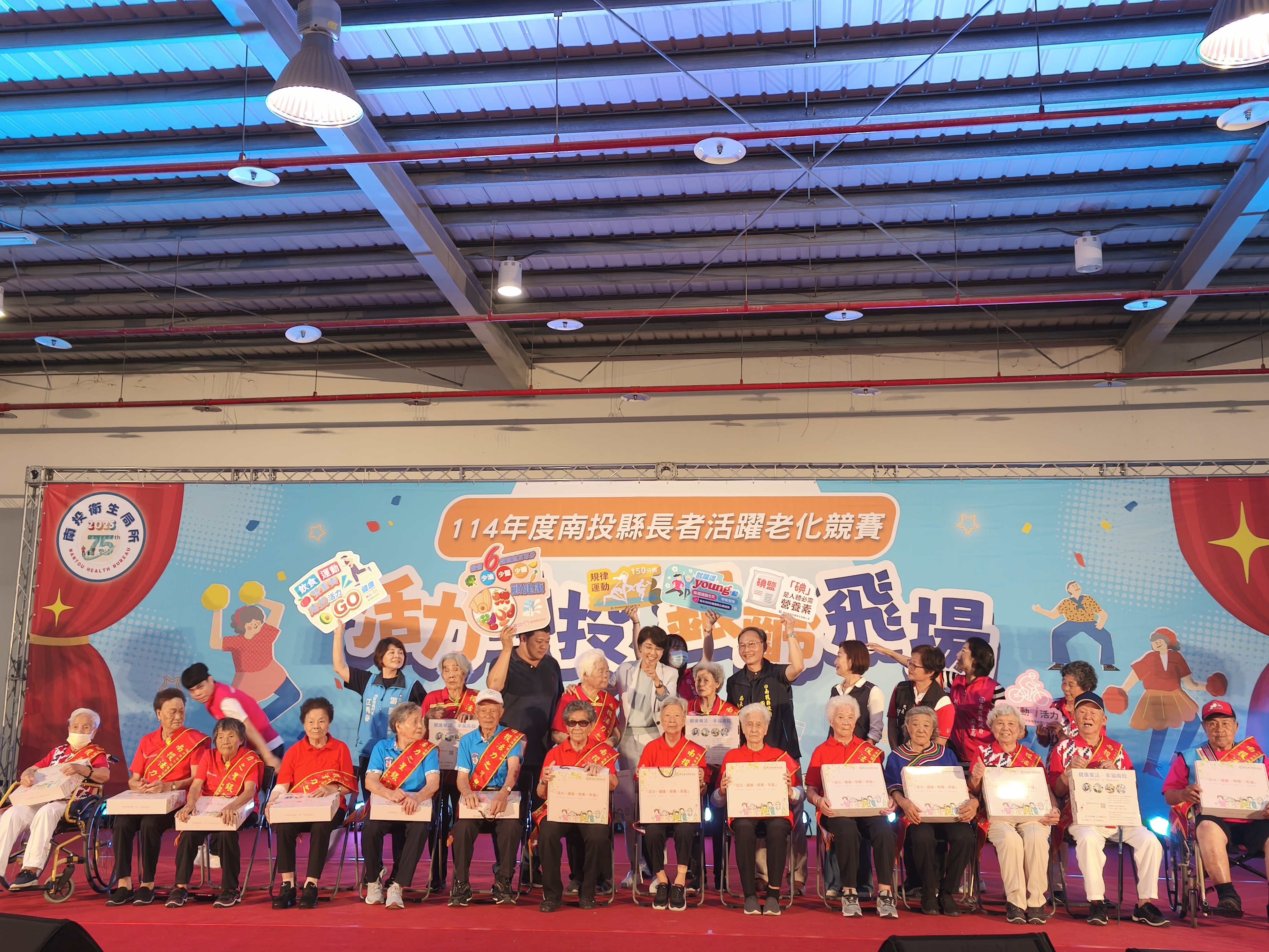 (特派員廖廣學 南投報導) 南投縣政府,為打造長者展現健康活力與生命價值的舞臺,衛生局26日在南投縣農工商會展中心舉辦「活力南投 銀齡飛揚-長者活躍老化競賽」,共有來自全縣13鄉鎮市代表隊伍、439位銀髮舞者齊聚一堂同台競賽;縣長許淑華親自到場頒獎給15位超過90歲的長者,並披上「南投活力之星 銀齡寶貝」榮耀彩帶,肯定每位參與者的不老精神與熱情表演。