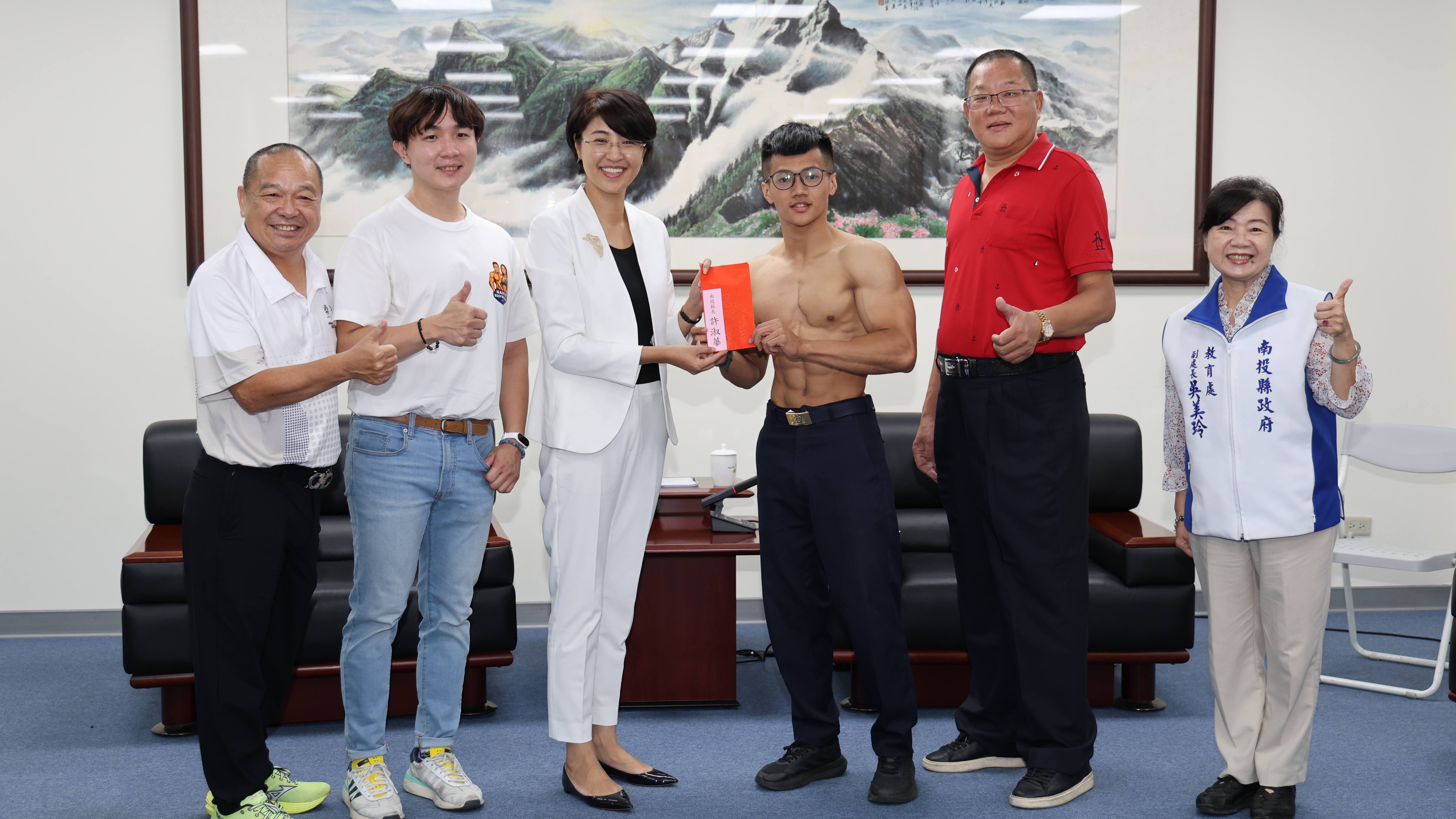 陪同拜會的還有縣體育會總幹事洪銘惠,代表南投縣健美健身委員會主委蔡宗智的總幹事廖科豪及縣府教育處副處長吳美玲,四位體態健碩充滿陽光氣息的男女選手,年紀都不大,分別只有26、28、29及32歲,卻各已有3到8年從事健美健身運動的資歷。